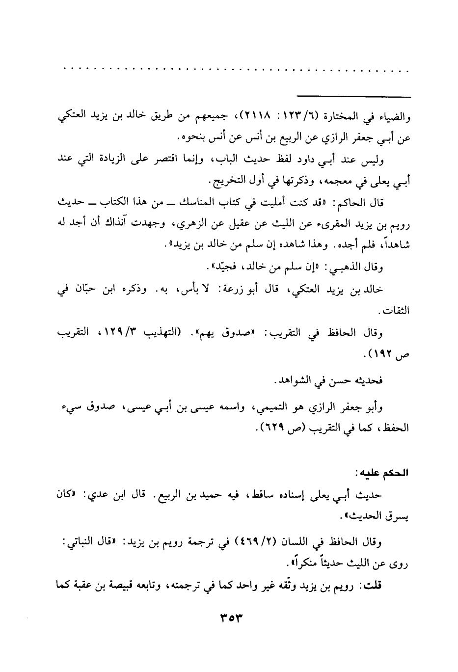 = والضياء في المختارة (6/ 123: 2118)، جميعهم من طريق خالد بن يزيد العتكي عَنْ أَبِي جَعْفَرٍ الرَّازِيُّ عَنِ الرَّبِيعِ بْنِ أَنَسٍ عَنْ أنس بنحوه.