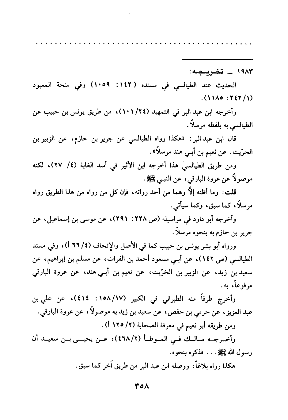 قال ابن عبد البر: "هكذا رَوَاهُ الطَّيَالِسِيُّ عَنْ جَرِيرِ بْنِ حَازِمٍ، عَنْ الزبير بن الخزيت. عن نعيم بن أبي هند مرسلًا".