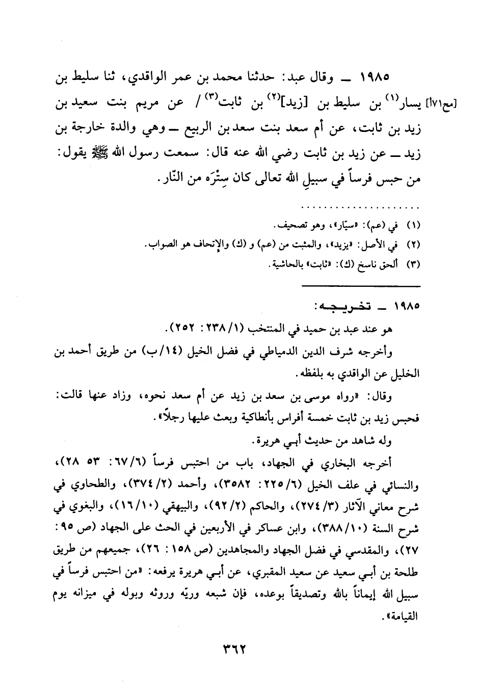1985 - وَقَالَ عَبْدٌ حَدَّثَنَا مُحَمَّدُ بْنُ عُمَرَ الْوَاقِدِيُّ ثنا سَلِيطُ بْنُ يَسَارِ بْنِ سَلِيطِ بْنِ زَيْدِ بْنِ ثَابِتٍ عَنْ مَرْيَمَ بِنْتِ سَعِيدِ بْنِ زَيْدِ بْنِ ثَابِتٍ عَنْ أُمِّ سَعْدِ بِنْتِ سَعْدِ بْنِ الرَّبِيعِ وَهِيَ وَالِدَةُ خَارِجَةَ بْنِ زَيْدٍ عَنْ زَيْدِ بْنِ ثَابِتٍ رَضِيَ الله عَنْه قَالَ سَمِعْتُ رَسُولَ اللَّهِ صَلَّى اللَّهُ عَلَيْهِ وَسَلَّمَ يَقُولُ §مَنْ حَبَسَ فَرَسًا فِي سَبِيلِ اللَّهِ تَعَالَى كَانَ سِتْرَهُ مِنَ النَّارِ