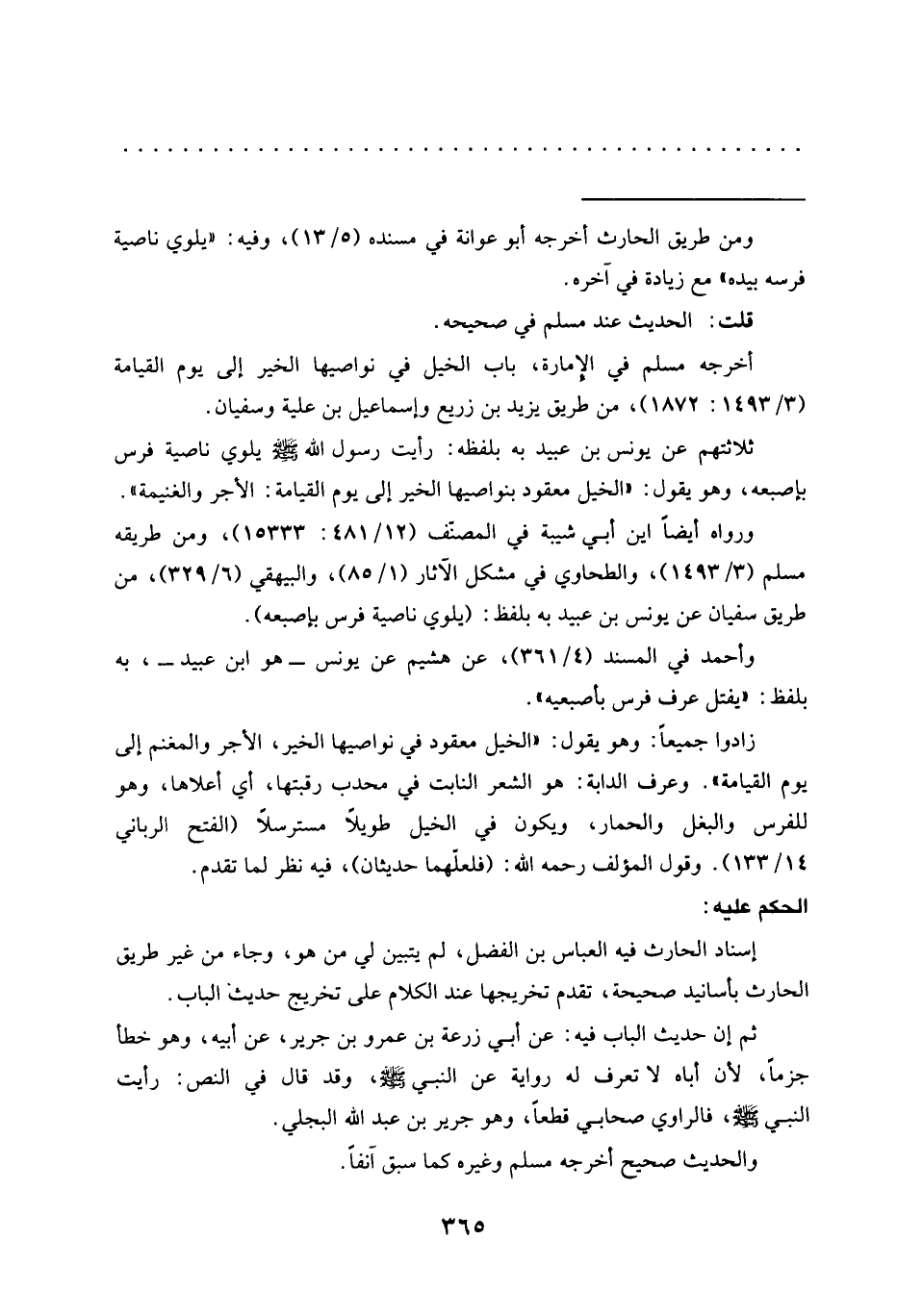 ورواه أيضًا اين أبي شيبة في المصنف (12/ 481: 15333)، ومن طريقه مسلم (3/ 1493)، والطحاوي في مشكل الآثار (1/ 85)، والبيهقي (6/ 329)، من طريق سفيان عن يونس بن عبيد به بلفظ: (يلوي ناصية فرس بإصبعه).