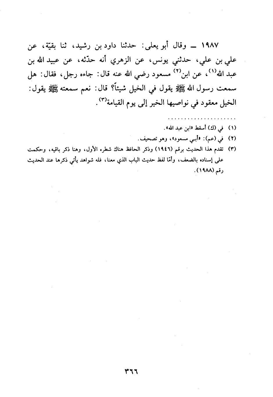 1987 - وَقَالَ أَبُو يَعْلَى حَدَّثَنَا دَاوُدُ بْنُ رُشَيْدٍ ثنا بَقِيَّةُ عَنْ عَلِيِّ بْنِ عَلِيٍّ حَدَّثَنِي يُونُسُ عَنِ الزُّهْرِيِّ أَنَّهُ حَدَّثَهُ عَنْ عُبَيْدِ اللَّهِ بْنِ عَبْدِ اللَّهِ عَنِ ابْنِ مَسْعُودٍ رَضِيَ الله عَنْه قَالَ جَاءَهُ رَجُلٌ فَقَالَ هَلْ سَمِعْتَ رَسُولَ اللَّهِ صَلَّى اللَّهُ عَلَيْهِ وَسَلَّمَ يَقُولُ فِي الْخَيْلِ شَيْئًا قَالَ نَعَمْ سَمِعْتُهُ صَلَّى اللَّهُ عَلَيْهِ وَسَلَّمَ يَقُولُ §الْخَيْلُ مَعْقُودٌ فِي نَوَاصِيهَا الْخَيْرُ إِلَى يَوْمِ الْقِيَامَةِ