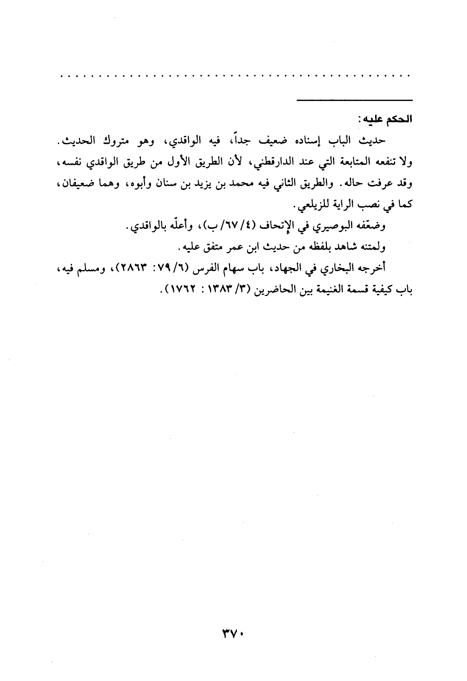ولا تنفعه المتابعة التي عند الدارقطني , لأن الطريق الأول من طريق الواقدي نفسه، وقد عرفت حاله. والطريق الثاني فيه محمَّد بن يزيد بن سنان وأبوه، وهما ضعيفان، كما في نصب الراية للزيلعي.