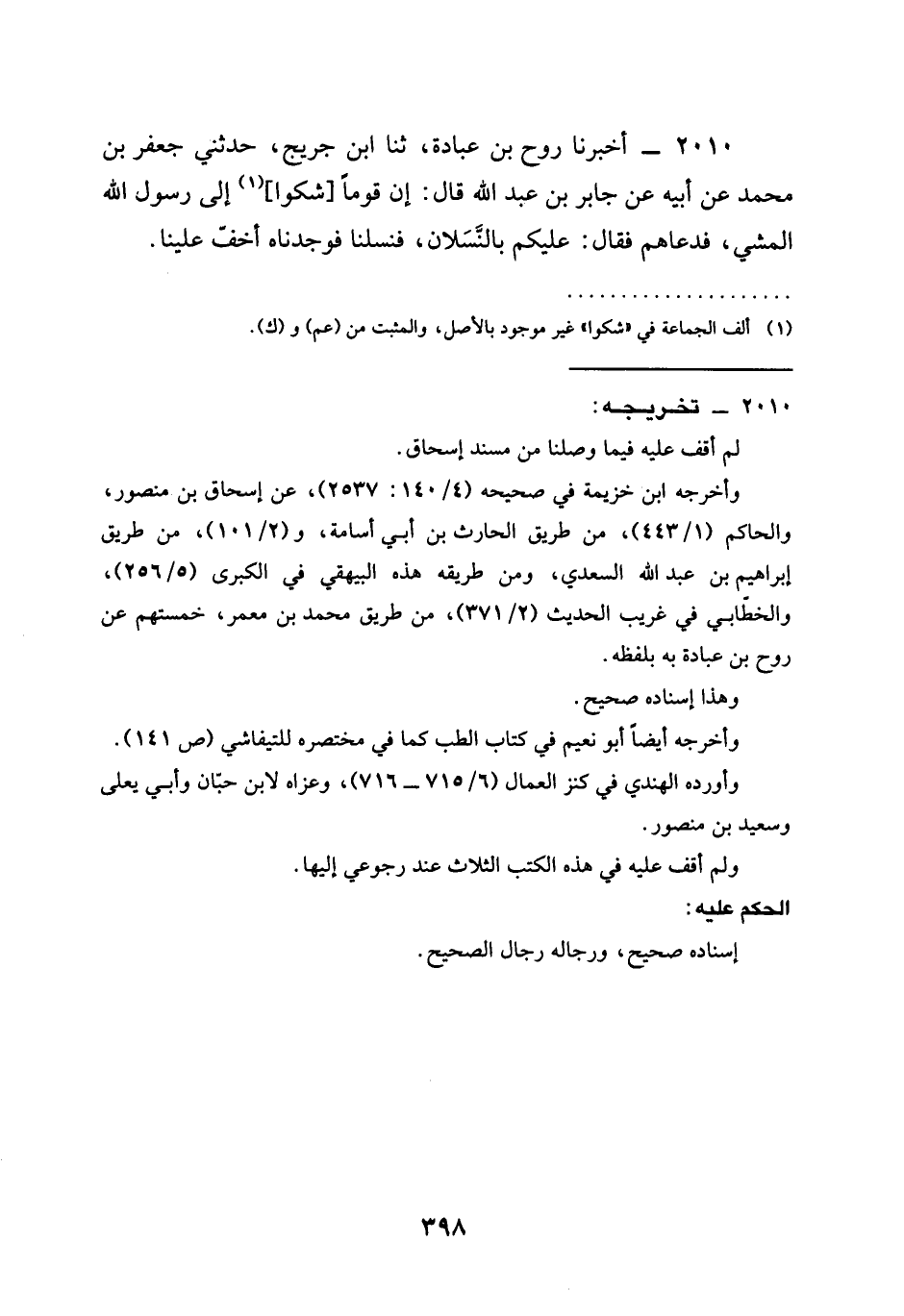 2010 - أَخْبَرَنَا رَوْحُ بْنُ عُبَادَةَ ثنا ابْنُ جُرَيْجٍ حَدَّثَنِي جَعْفَرُ بْنُ مُحَمَّدٍ عَنْ أَبِيهِ عَنْ جَابِرِ بْنِ عَبْدِ اللَّهِ قَالَ إِنَّ قَوْمًا شَكَوْا إِلَى رَسُولِ اللَّهِ الْمَشْيَ فَدَعَاهُمْ فَقَالَ §عَلَيْكُمْ بِالنَّسْلَانِ فَنَسَلْنَا فَوَجَدْنَاهُ أَخَفَّ عَلَيْنَا