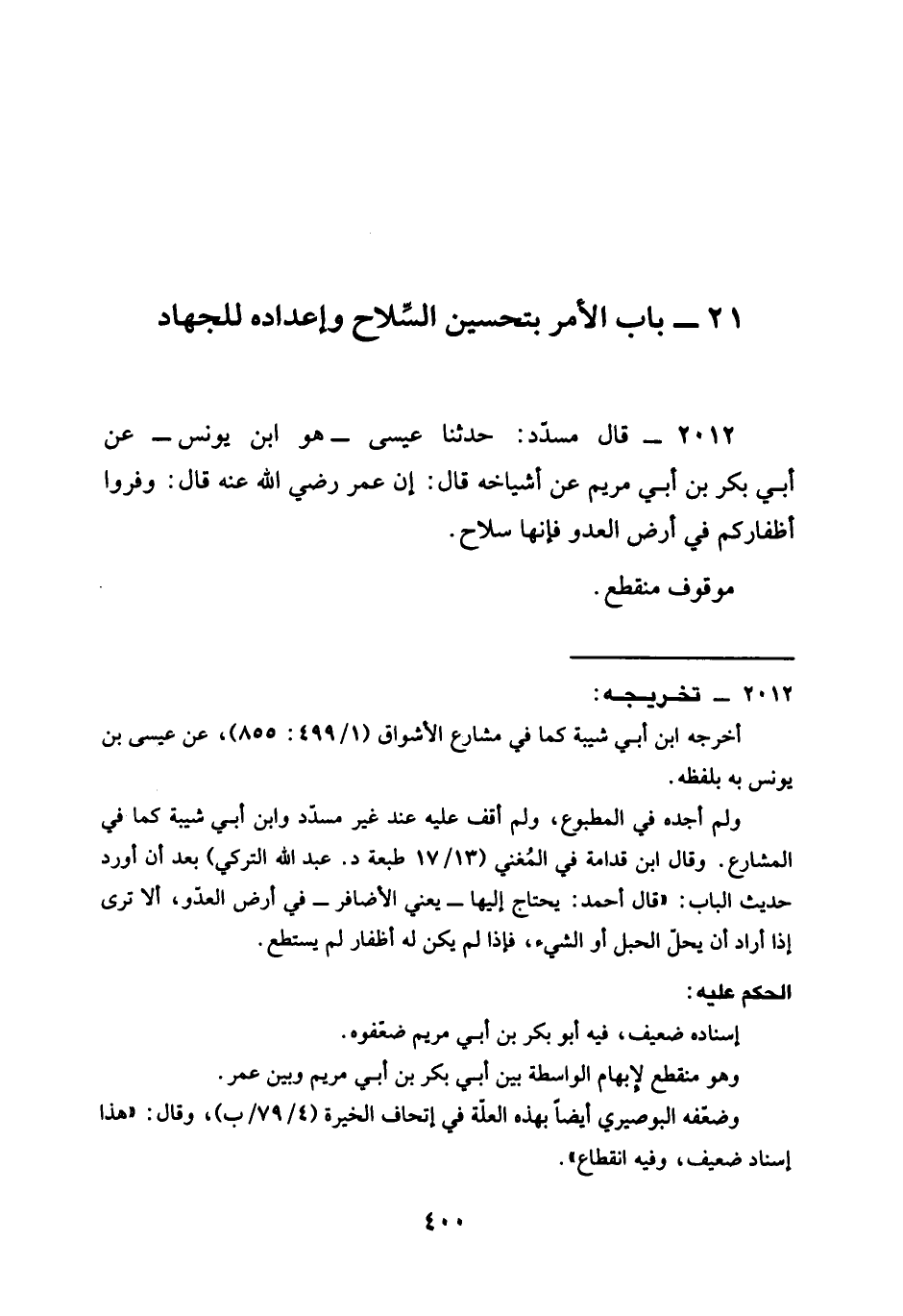 2012 - قَالَ مُسَدَّدٌ حَدَّثَنَا عِيسَى هُوَ ابْنُ يُونُسَ عَنْ أَبِي بَكْرِ بْنِ أَبِي مَرْيَمَ عَنْ أَشْيَاخِهِ قَالَ إِنَّ عُمَرَ رَضِيَ اللَّهٌُ عَنْهُ قَالَ §وَفِّرُوا أَظْفَارَكُمْ فِي أَرْضِ الْعَدُوِّ فَإِنَّهَا سِلَاحٌ