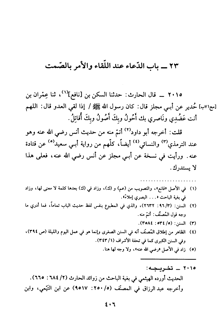 2015 - قَالَ الْحَارِثُ حَدَّثَنَا السَّكَنُ بْنُ نَافِعٍ ثَنَا عِمْرَانُ بْنُ حُدَيْرٍ عَنْ أَبِي مِجْلَزٍ قَالَ كَانَ رَسُولُ اللَّهِ صَلَّى اللَّهُ عَلَيْهِ وَسَلَّمَ §إِذَا لَقِيَ الْعَدُوَّ قَالَ اللَّهُمَّ أَنْتَ عَضُدِي وَنَاصِرِي بِكَ أَحُولُ وَبِكَ أُصُولُ وَبِكَ أُقَاتِلُ قُلْتُ أَخْرَجَهُ أَبُو دَاوُدَ أَتَمَّ مِنْهُ مِنْ حَدِيثِ أَنَسٍ رَضِيَ الله عَنْه وَهُوَ عِنْدَ التِّرْمِذِيِّ وَالنَّسَائِيِّ أَيْضًا كُلُّهُمْ مِنْ رِوَايَةِ أَبِي سَعِيدٍ عَنْ قَتَادَةَ عَنْهُ وَرَأَيْتُ فِيَ نُسْخَةِ عَنْ أَبِي مِجْلَزٍ عَنْ أَنَسٍ رَضِيَ الله عَنْه فَعَلَى هَذَا لَا يُسْتَدْرَكُ