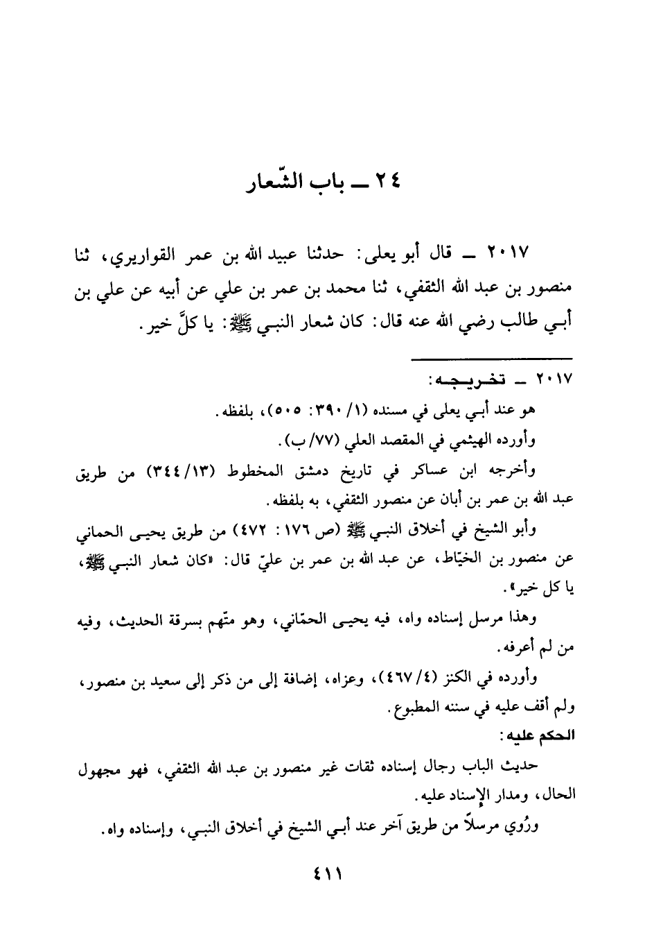 2017 - قَالَ أَبُو يَعْلَى حَدَّثَنَا عُبَيْدُ اللَّهِ بْنُ عُمَرَ الْقَوَارِيرِيُّ ثنا مَنْصُورُ بْنُ عَبْدِ اللَّهِ الثَّقَفِيُّ ثنا مُحَمَّدُ بْنُ عُمَرَ بْنِ عَلِيٍّ عَنْ أَبِيهِ عن علي بين أَبِي طَالِبٍ رَضِيَ الله عَنْه قَالَ §كَانَ شِعَارُ النَّبِيِّ صَلَّى اللَّهُ عَلَيْهِ وَسَلَّمَ يَا كُلَّ خَيْرٍ