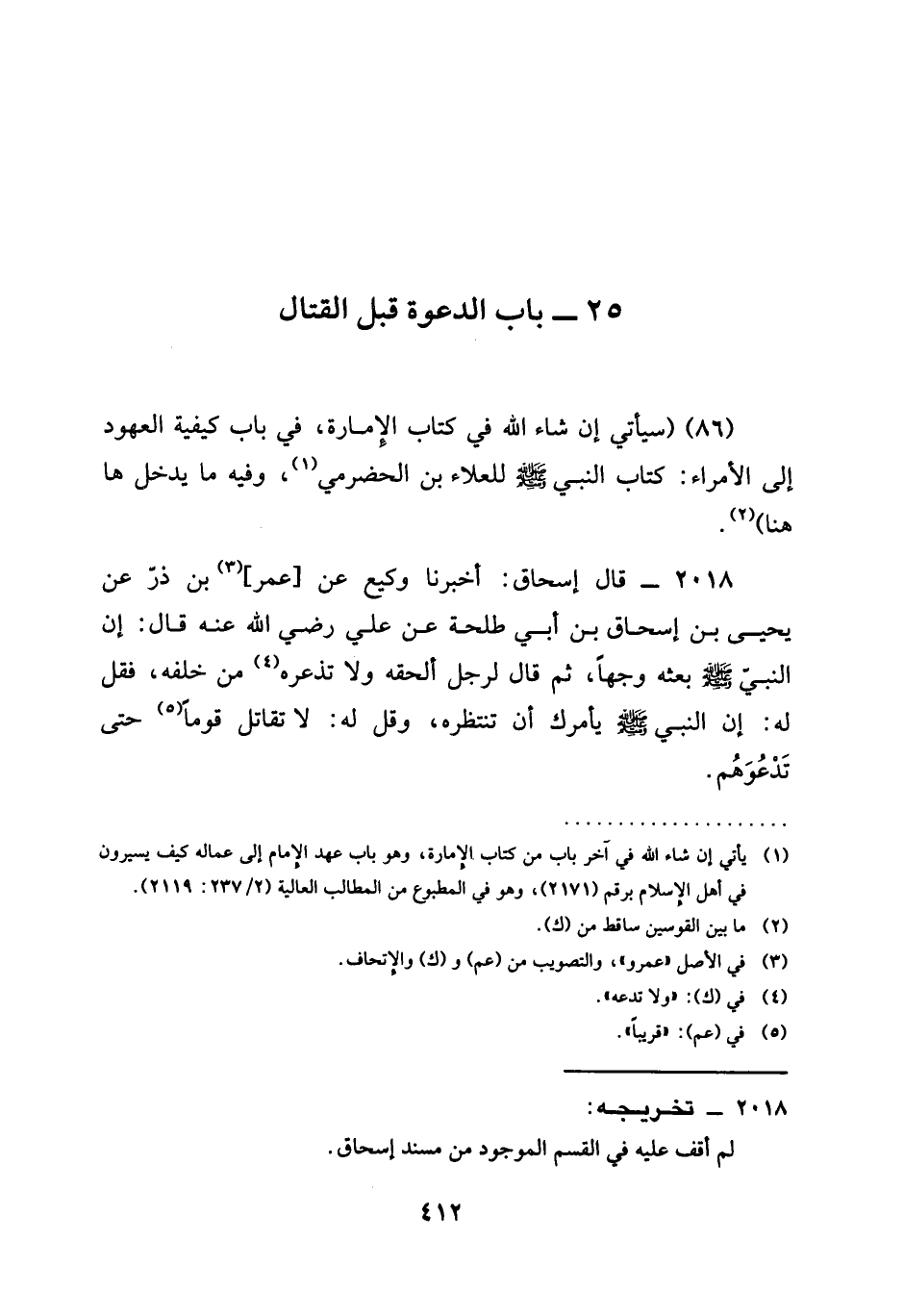 2018 - قَالَ إِسْحَاقُ أَخْبَرَنَا وَكِيعٌ عَنْ عُمَرَ بْنِ ذَرٍّ عَنْ يَحْيَى بْنِ إِسْحَاقَ بْنِ أَبِي طَلْحَةَ عَنْ عَلِيٍّ رَضِيَ الله عَنْه قَالَ إنَّ النَّبِيَّ صَلَّى اللَّهُ عَلَيْهِ وَسَلَّمَ بَعَثَهُ وَجْهًا ثُمَّ قَالَ لِرَجُلٍ الْحَقْهُ وَلَا تُذْعِرْهُ مِنْ خَلْفِهِ فَقُلْ لَهُ إِنَّ النَّبِيَّ صَلَّى اللَّهُ عَلَيْهِ وَسَلَّمَ يَأْمُرُكَ أَنْ تَنْتَظِرَهَ وَقُلْ لَهُ §لَا تُقَاتِلْ قَوْمًا حَتَّى تَدْعُوَهُمْ