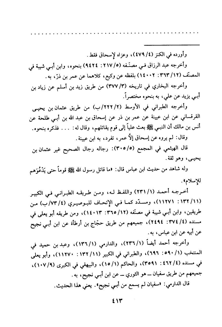 وأخرجه الطبراني في الأوسط (2/ 222/ ب) من طريق عثمان بن يحيى القرقساني عن ابن عيينة عن عمر بن ذر عَنْ إِسْحَاقَ بْنِ عَبْدِ اللَّهِ بْنِ أَبِي طلحة عن أنس بن مالك أَنَّ النَّبِيَّ -صَلَّى اللَّهُ عَلَيْهِ وَسَلَّمَ- بَعَثَ عليًا إلى قوم يقاتلهم، وقال له: ... فذكره بنحوه.