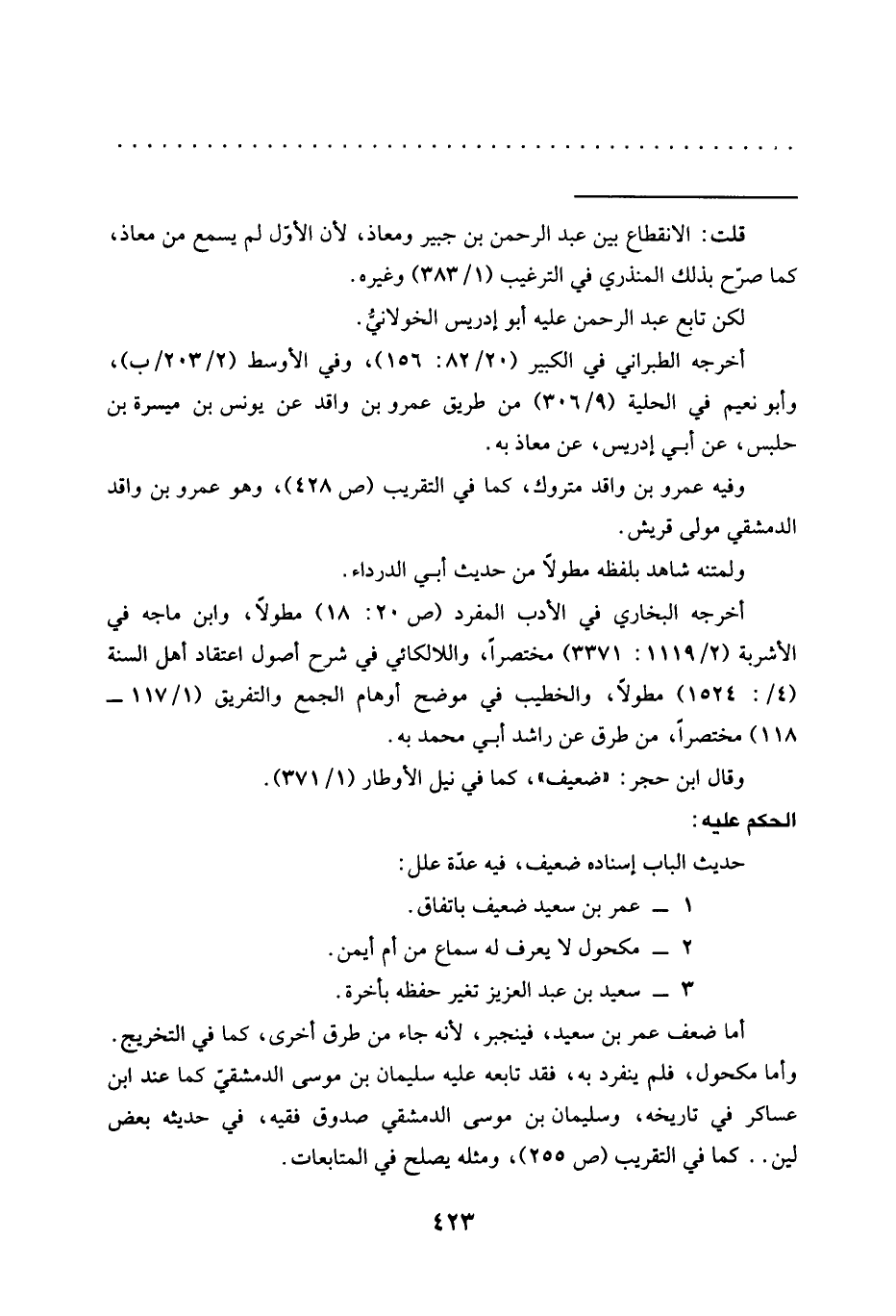 = قلت: الانقطاع بين عبد الرحمن بن جبير ومعاذ , لأن الأوّل لم يسمع من معاذ، كما صرّح بذلك المنذري في الترغيب (1/ 383) وغيره.