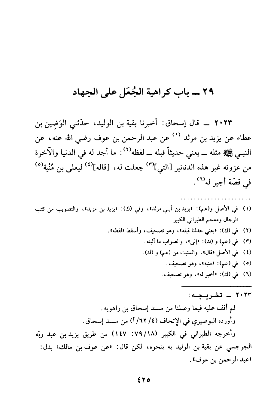 2023 - قَالَ إِسْحَاقُ أَخْبَرَنَا بَقِيَّةُ بْنُ الْوَلِيدِ حَدَّثَنِي الْوَضِينُ بْنُ عَطَاءٍ عَنْ يَزِيدَ بْنِ مَرْثَدٍ عَنْ عَبْدِ الرَّحْمَنِ بْنِ عَوْفٍ رَضِيَ الله عَنْه عَنِ النَّبِيِّ صَلَّى اللَّهُ عَلَيْهِ وَسَلَّمَ مِثْلَهُ يَعْنِي قَبْلَهُ لَفْظُهُ §مَا أَجِدُ لَهُ فِي الدُّنْيَا وَالْآخِرَةِ مِنْ غَزْوَتِهِ غَيْرَ هَذِهِ الدَّنَانِيرِ الَّتِي جعلت له حديثا قَالَهُ لِيَعْلَى بْنُ مُنْيَةَ فِي قِصَّةِ أَجِيرٍ لَهُ