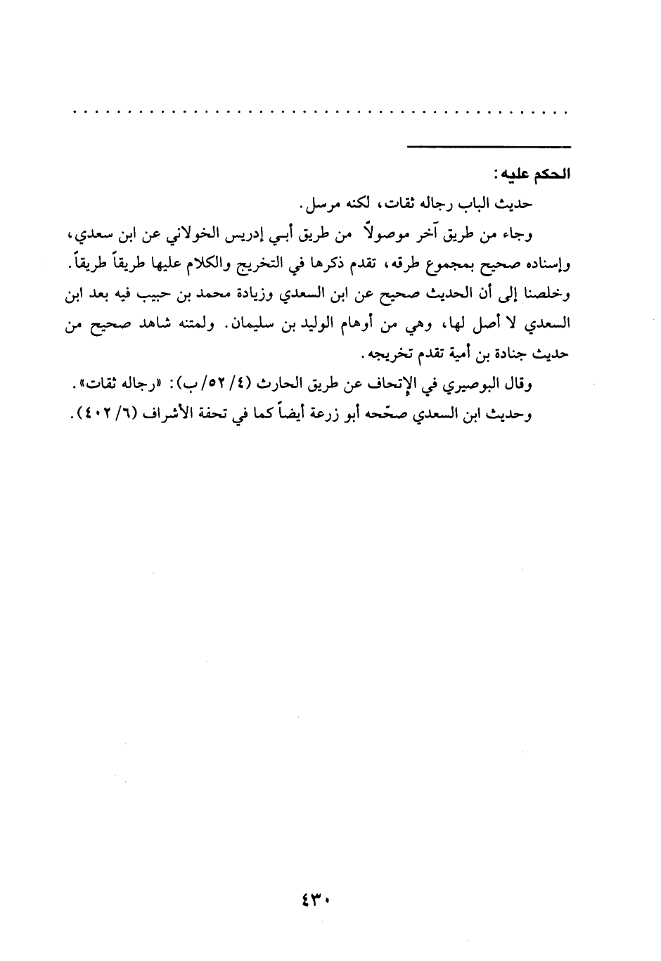 وخلصنا إلى أن الحديث صحيح عن ابن السعدي وزيادة محمَّد بن حبيب فيه بعد ابن السعدي لا أصل لها، وهي من أوهام الوليد بن سليمان. ولمتنه شاهد صحيح من حديث جنادة بن أمية تقدم تخريجه.