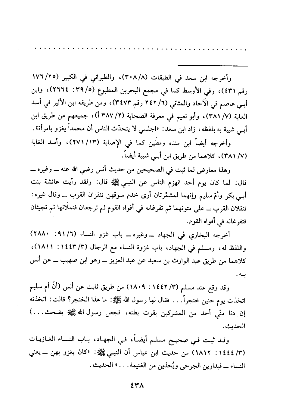 وهذا معارض لما ثبت في الصحيحين من حديث أنس رضي الله عنه -وغيره- قال: لما كان يوم أحد انهزم الناس عَنِ النَّبِيِّ -صَلَّى اللَّهُ عَلَيْهِ وَسَلَّمَ- قَالَ: ولقد رأيت عائشة بنت أبي بكر وأم سليم وإنهما لمشمِّرتان أرى خدم سوقهن تنقزان القرب -وقال غيره: تنقلان القرب- على متونهما ثم تفرغانه في أفواه القوم ثم ترجعان فتملآنها ثم تجيئان فتفرغانه في أفواه القوم.