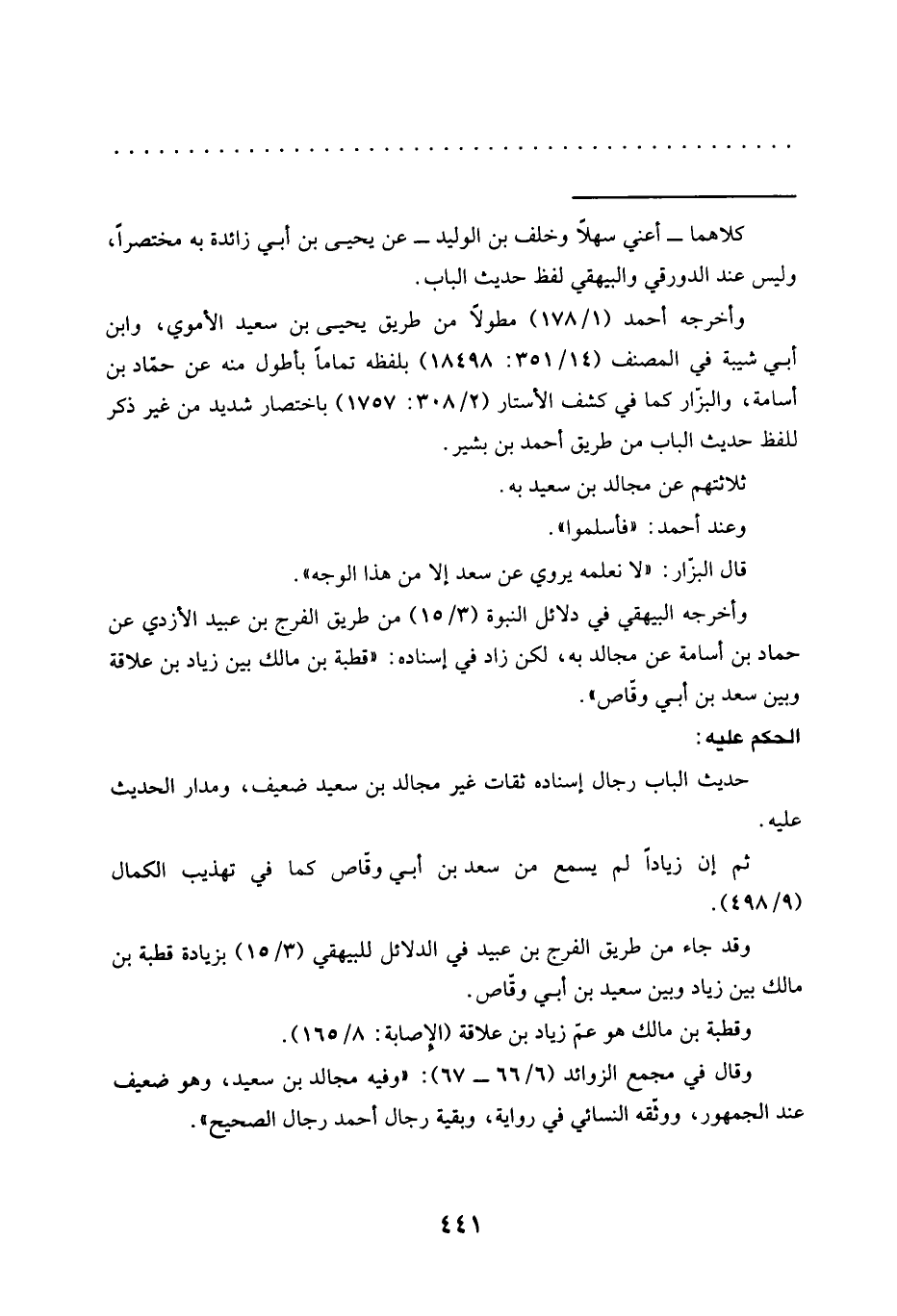 وقال في مجمع الزوائد (6/ 66 - 67): "وفيه مجالد بن سعيد، وهو ضعيف عند الجمهور، ووثّقه النسائي في رواية , وبقية رجال أحمد رجال الصحيح".