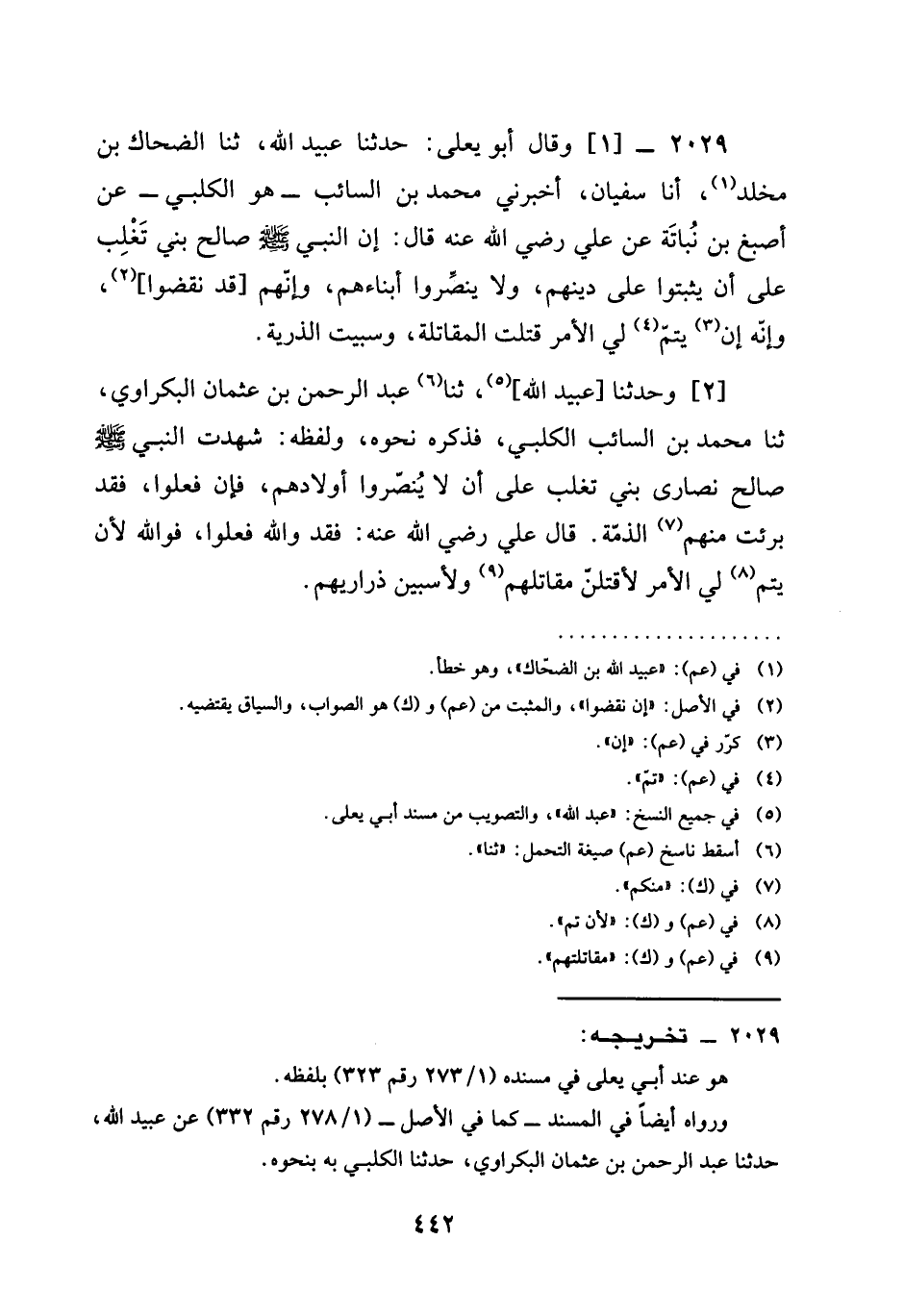 2029 - وَقَالَ أَبُو يَعْلَى حَدَّثَنَا عُبَيْدُ اللَّهِ ثنا الضَّحَّاكُ بْنُ مخلدٍ أنا سُفْيَانُ أَخْبَرَنِي مُحَمَّدُ بْنُ السَّائِبِ هُوَ الْكَلْبِيُّ عَنْ أَصْبَغَ بْنِ نُبَاتَةَ عَنْ عَلِيٍّ رَضِي اللَّهُ عَنْهُ قَالَ إِنَّ النَّبِيَّ صَلَّى اللَّهُ عَلَيْهِ وَسَلَّمَ §صَالَحَ بَنِي تَغْلِبَ عَلَى أَنْ يَثْبُتُوا عَلَى دِينِهِمْ وَلَا يُنَصِّرُوا أَبْنَاءَهُمْ وَإِنَّهُمْ قَدْ نَقَضُوا وَإِنَّهُ إِنْ يَتِمَّ لِي الْأَمْرُ قَتَلْتُ الْمُقَاتِلَةَ وَسَبَيْتُ الذُّرِّيَّةَ