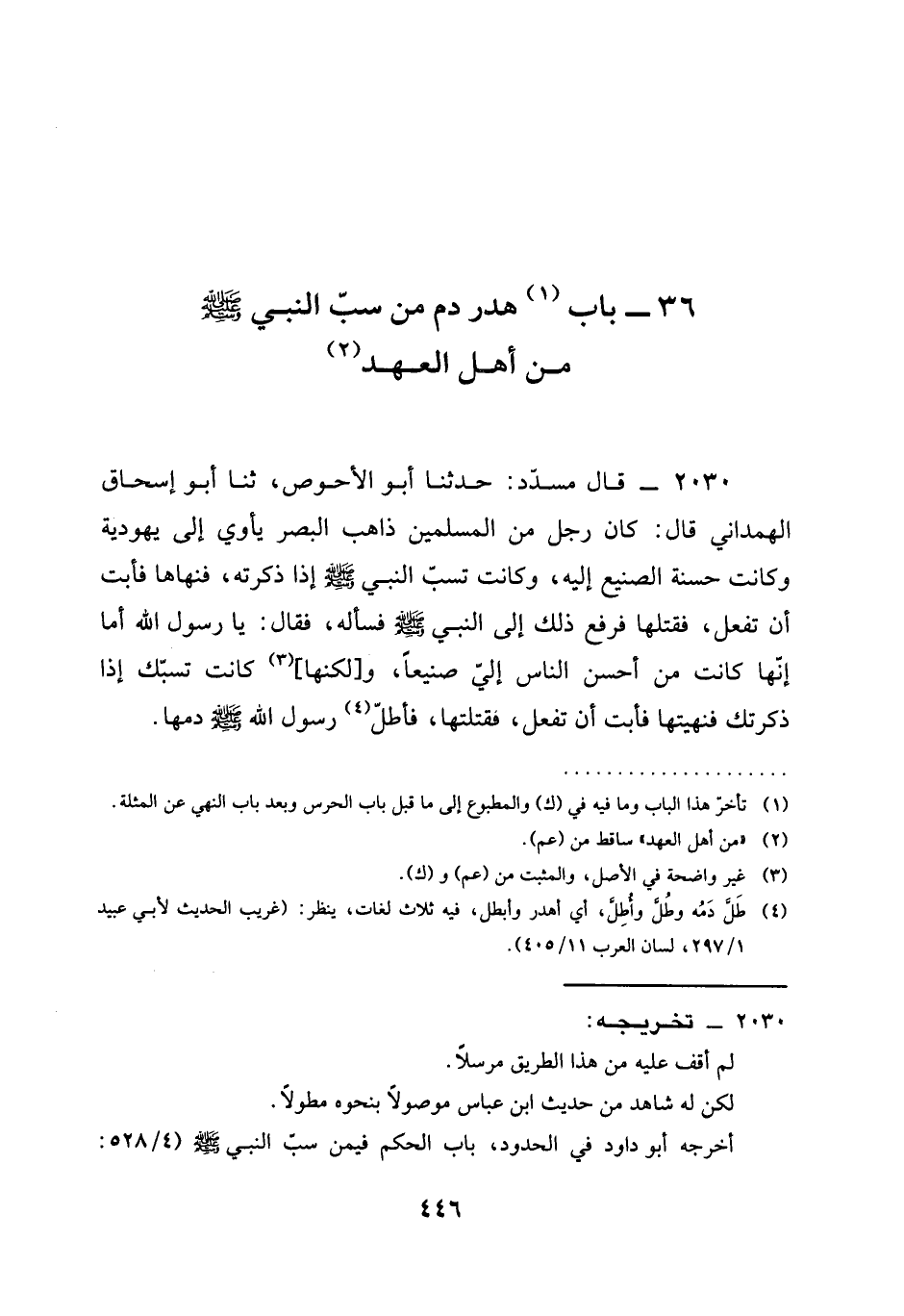 2030 - قَالَ مُسَدَّدٌ حَدَّثَنَا أَبُو الْأَحْوَصِ ثنا أَبُو إِسْحَاقَ الهمذاني قَالَ كَانَ رَجُلٌ مِنَ الْمُسْلِمِينَ ذَاهِبُ الْبَصَرِ يَأْوِي إِلَى يَهُودِيَّةٍ وَكَانَتْ حَسَنَةَ الصَّنِيعِ إِلَيْهِ §وَكَانَتْ تَسُبُّ النَّبِيَّ صَلَّى اللَّهُ عَلَيْهِ وَسَلَّمَ إِذَا ذَكَرَتْهُ فَنَهَاهَا فَأَبَتْ أَنْ تَفْعَلَ فَقَتَلَهَا فَرُفِعَ ذَلِكَ إِلَى النَّبِيِّ صَلَّى اللَّهُ عَلَيْهِ وَسَلَّمَ فَسَأَلَهُ فَقَالَ يَا رَسُولَ اللَّهِ أَمَا إِنَّهَا كَانَتْ مِنْ أَحْسَنِ النَّاسِ إِلَيَّ صَنِيعًا وَلَكِنَّهَا كَانَتْ تَسُبُّكَ إِذَا ذَكَرَتْكَ فَنَهَيْتُهَا فَأَبَتْ أَنْ تَفْعَلَ فَقَتَلْتُهَا فَأَطَلَّ رَسُولُ اللَّهِ صَلَّى اللَّهُ عَلَيْهِ وَسَلَّمَ دَمَهَا
