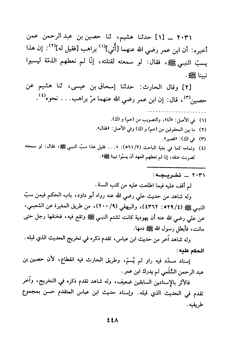 2031 - حَدَّثَنَا هُشَيْمٌ ثنا حُصَيْنُ بْنُ عَبْدِ الرَّحْمَنِ عَمَّنْ أَخْبَرَهُ أَنَّ ابن عمر رَضِيَ الله عَنْهما أُتِيَ بِرَاهِبٍ فَقِيلَ لَهُ إِنَّ §هَذَا يَسُبُّ النَّبِيَّ صَلَّى اللَّهُ عَلَيْهِ وَسَلَّمَ فَقَالَ لَوْ سَمِعْتُهُ لَقَتَلْتُهُ إِنَّا لَمْ نُعْطِهِمُ الذِّمَّةَ لِيَسُبُّوا نَبِيَّنَا صَلَّى اللَّهُ عَلَيْهِ وَسَلَّمَ