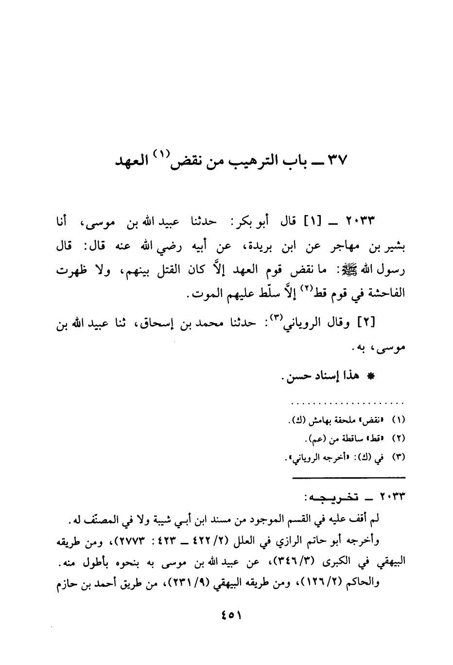 2033 - قَالَ أَبُو بَكْرٍ حَدَّثَنَا عُبَيْدُ اللَّهِ بْنِ مُوسَى أنا بَشِيرُ بْنُ مُهَاجِرٍ عَنِ ابْنِ بُرَيْدَةَ عَنْ أَبِيهِ رَضِيَ الله عَنْه قَالَ قَالَ رَسُولُ اللَّهِ صَلَّى اللَّهُ عَلَيْهِ وَسَلَّمَ §مَا نَقْضَ قَوْمٌ الْعَهْدَ إِلَّا كَانَ الْقَتْلُ بَيْنَهُمْ وَلَا ظَهَرَتِ الْفَاحِشَةُ فِي قَوْمٍ قَطُّ إِلَّا سُلِّطَ عَلَيْهِمُ الْمَوْتُ