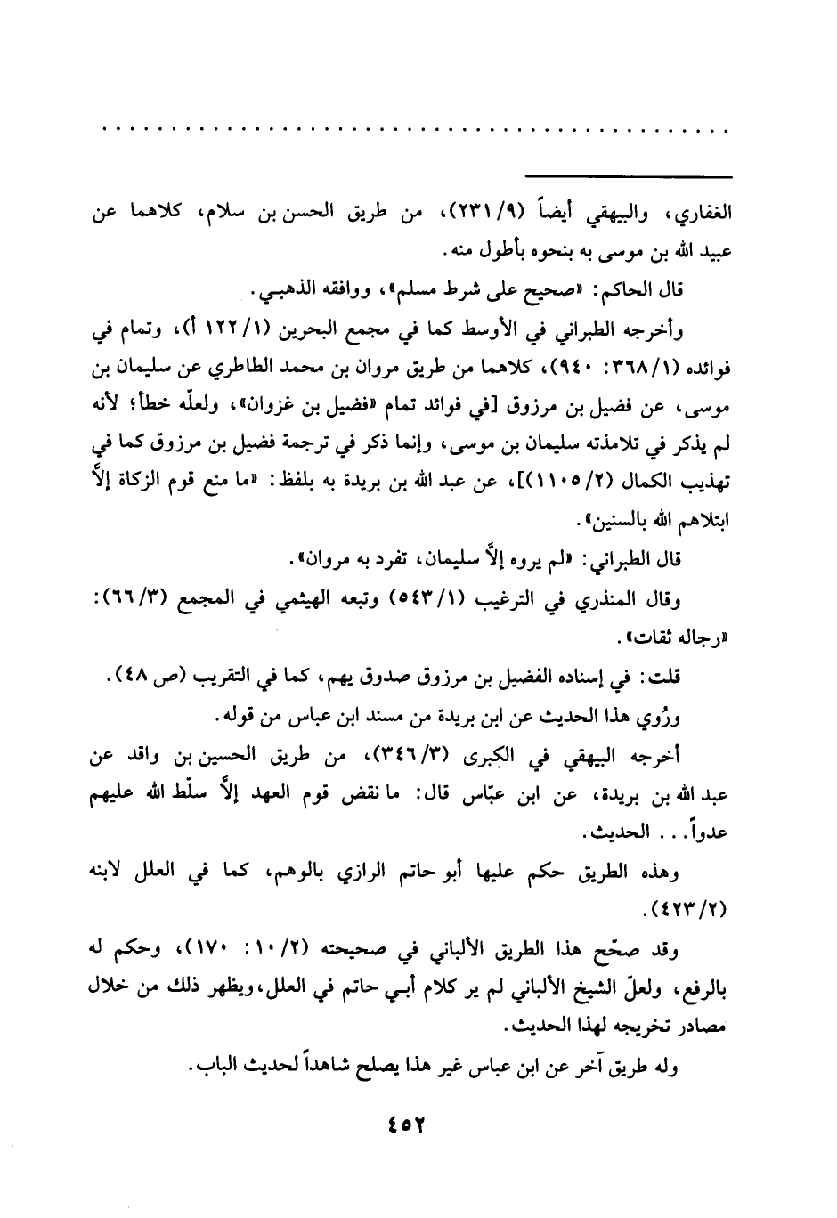 وقد صحّح هذا الطريق الألباني في صحيحته (2/ 10: 170)، وحكم له بالرفع، ولعل الشيخ الألباني لم ير كلام أبي حاتم في العلل، ويظهر ذلك من خلال مصادر تخريجه لهذا الحديث.