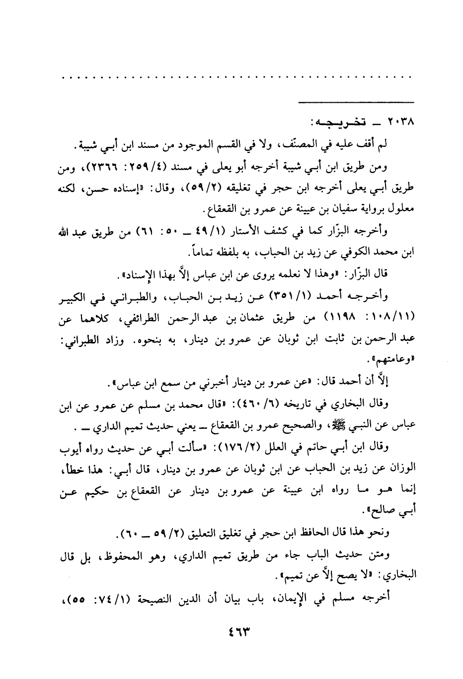 ومن طريق ابن أبي شيبة أخرجه أبو يعلى في مسند (4/ 259: 2366)، ومن طريق أبي يعلى أخرجه ابن حجر في تغليقه (2/ 59)، وقال: "إسناده حسن، لكنه معلول برواية سفيان بن عيينة عن عمرو بن القعقاع.