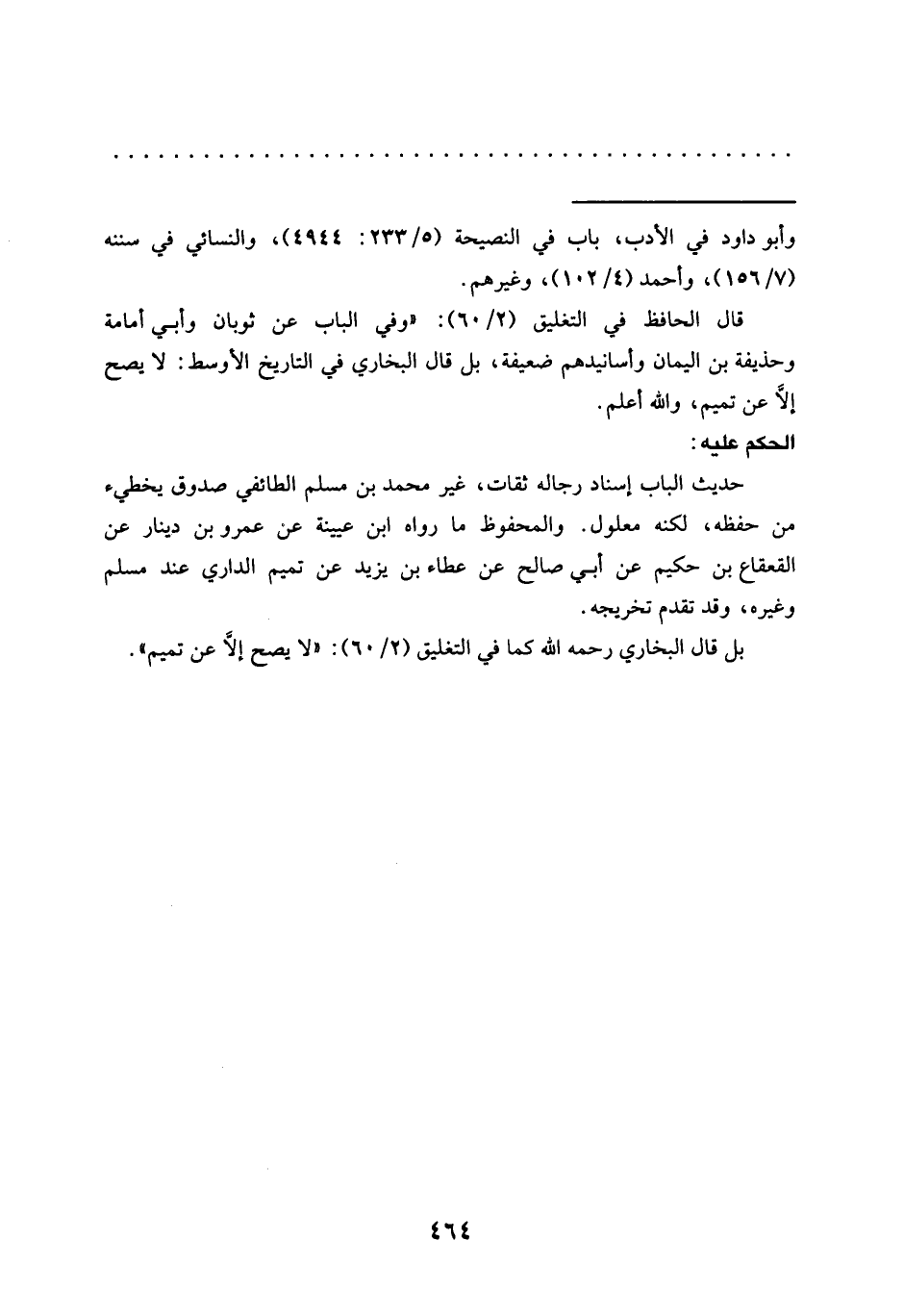 قال الحافظ في التغليق (2/ 60): "وفي الباب عن ثوبان وأبي أمامة وحذيفة بن اليمان وأسانيدهم ضعيفة، بل قال البخاري في التاريخ الأوسط: لا يصح إلَّا عن تميم، والله أعلم.