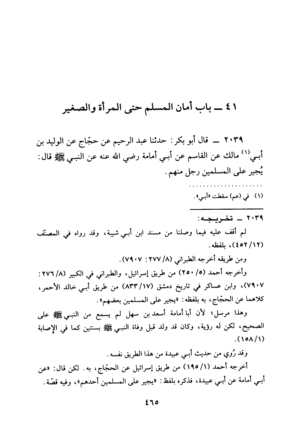 2039 - قَالَ أَبُو بَكْرٍ حَدَّثَنَا عَبْدُ الرَّحِيمٍ عَنْ حَجَّاجٍ عَنِ الْوَلِيدِ بْنِ أَبِي مَالِكٍ عَنِ الْقَاسِمِ عَنْ أَبِي أُمَامَةَ رَضِيَ الله عَنْه عَنِ النَّبِيِّ صَلَّى اللَّهُ عَلَيْهِ وَسَلَّمَ قَالَ §يُجِيرُ عَلَى الْمُسْلِمِينَ رَجُلٌ مِنْهُمْ