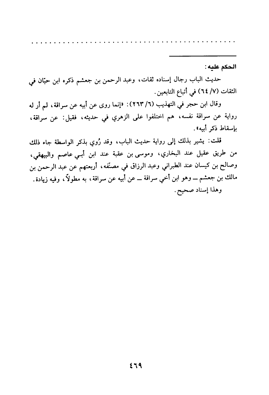 وقال ابن حجر في التهذيب (6/ 263): "إنما روى عن أبيه عن سراقة، لم أر له رواية عن سراقة نفسه، هم اختلفوا على الزهري في حديثه، فقيل: عن سراقة، بإسقاط ذكر أبيه".