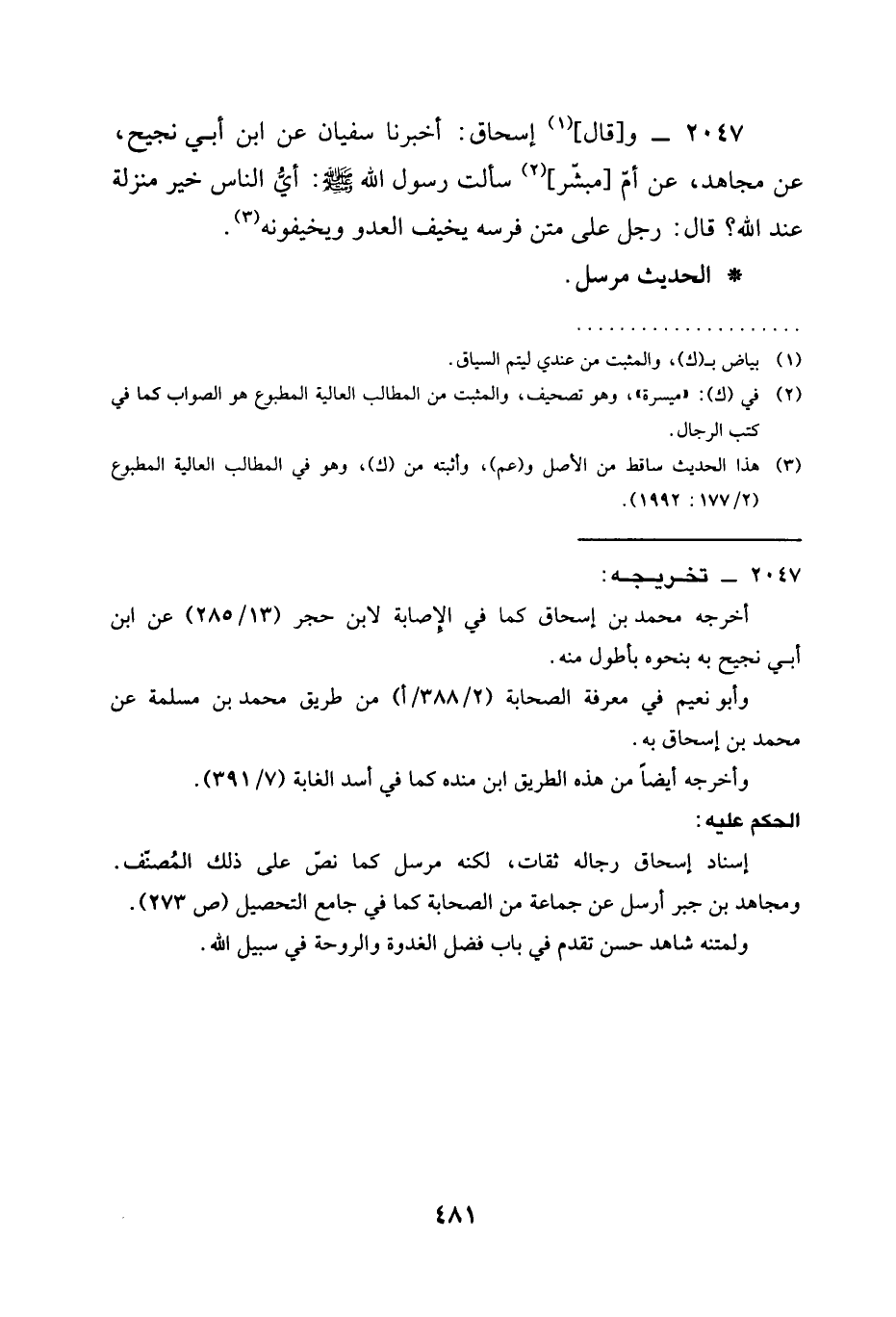 2047 - وَقَالَ إِسْحَاقُ أَخْبَرَنَا سُفْيَانُ عَنِ ابْنِ أَبِي نُجَيْحٍ عَنْ مُجَاهِدٍ عَنْ أُمَّ مُبَشِّرٍ سَأَلَتْ رَسُولَ اللَّهِ صَلَّى اللَّهُ عَلَيْهِ وَسَلَّمَ §أَيُّ النَّاسِ خَيْرٌ مَنْزِلَةً عِنْدَ اللَّهِ قَالَ رَجُلٌ عَلَى مَتْنِ فَرَسِهِ يُخِيفُ الْعَدُوَّ وَيُخِيفُونَهُ