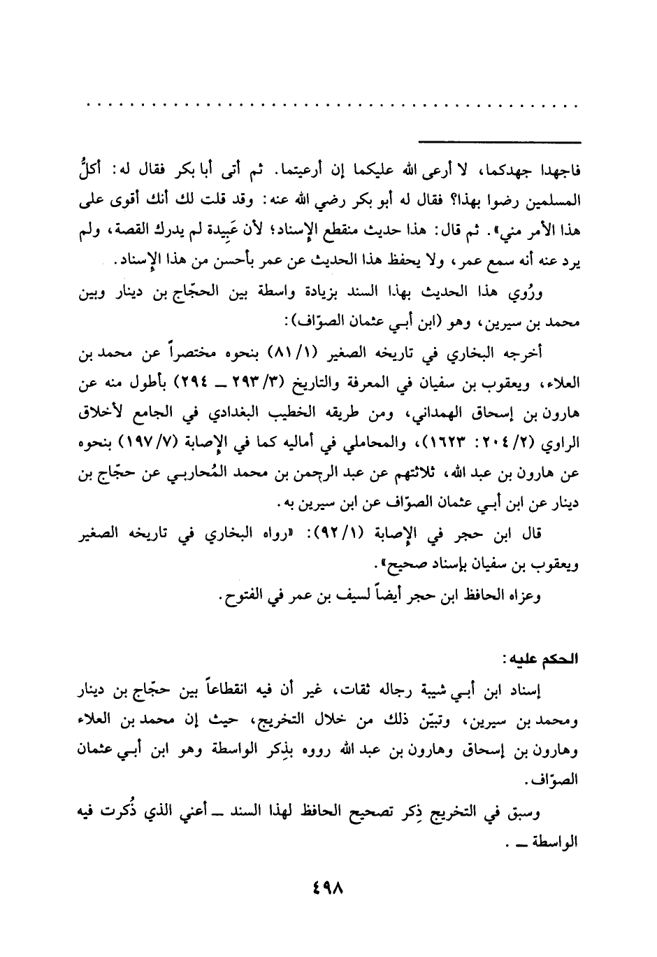 إسناد ابن أبي شيبة رجاله ثقات، غير أن فيه انقطاعًا بين حجاج بن دينار ومحمد بن سيرين، وتبيّن ذلك من خلال التخريج، حيث إن محمد بن العلاء وهارون بن إسحاق وهارون بن عبد الله رووه بذِكر الواسطة وهو ابن أبي عثمان الصوّاف.