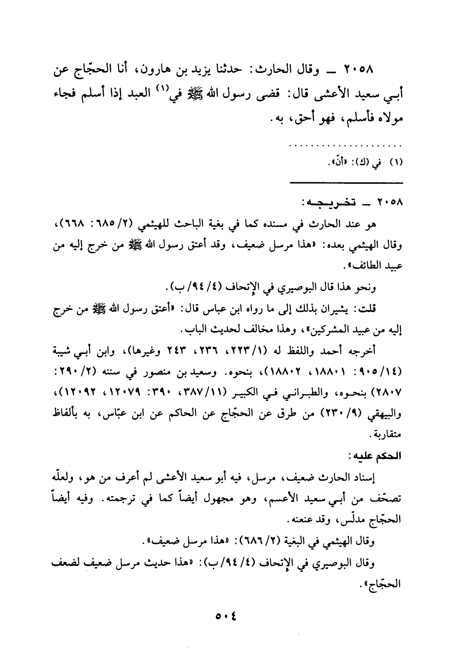 2058 - وَقَالَ الْحَارِثُ حدثنا يزيد ين هَارُونَ أنا الْحَجَّاجُ عَنْ أَبِي سَعِيدٍ الْأَعْشَى قَالَ قَضَى رَسُولُ اللَّهِ صَلَّى اللَّهُ عَلَيْهِ وَسَلَّمَ §فِي الْعَبْدَ إِذَا أَسْلَمَ فَجَاءَ مَوْلَاهُ فَأَسْلَمَ فَهُوَ أَحَقُّ بِهِ