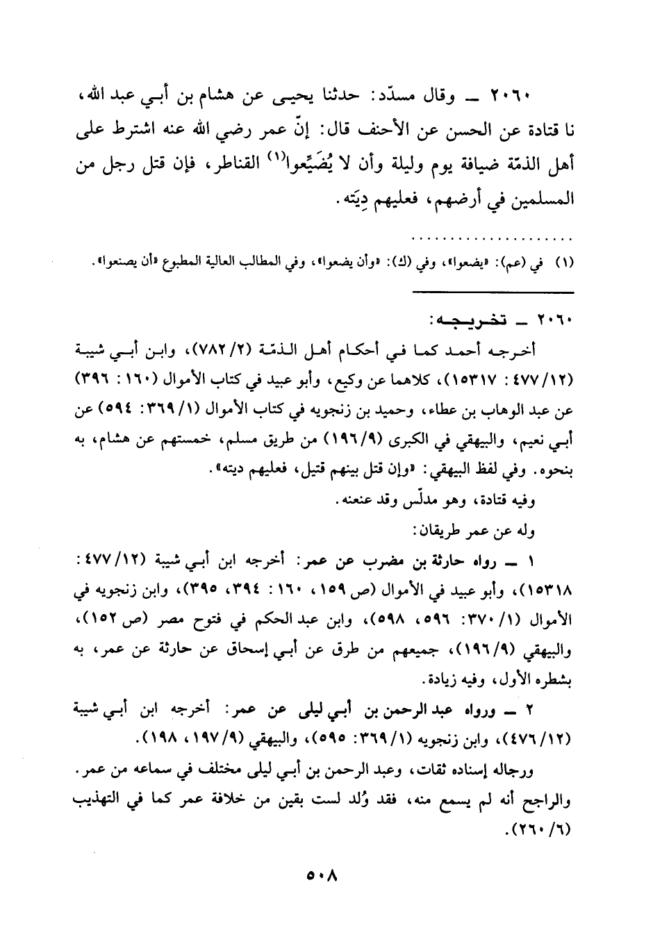 2060 - وَقَالَ مُسَدَّدٌ حَدَّثَنَا يَحْيَى عَنْ هِشَامِ بْنِ أَبِي عبد الله ثنا قَتَادَةُ عَنِ الْحَسَنِ عَنِ الْأَحْنَفِ قَالَ إَِنَّ عُمَرَ رَضِيَ الله عَنْه §اشْتَرَطَ عَلَى أَهْلِ الذِّمَّةِ ضِيَافَةَ يَوْمٍ وَلَيْلَةٍ وَأَنْ لا يضيعوا يُضَيِّعُوا الْقَنَاطِرَ فَإِنْ قُتِلَ رَجُلٌ مِنَ الْمُسْلِمِينَ فِي أَرْضِهِمْ فَعَلَيْهِمْ دِيَتُهُ