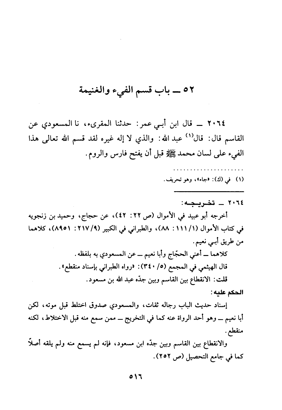 2064 - قَالَ ابْنُ أَبِي عُمَرَ حدثنا المقرئ ثنا الْمَسْعُودِيُّ عَنِ الْقَاسِمِ قَالَ قَالَ عَبْدُ اللَّهِ وَالَّذِي لا الله غَيْرُهُ §لَقَدْ قَسَمَ اللَّهُ تَعَالَى هَذَا الْفَيْءَ عَلَى لِسَانِ مُحَمَّدٍ صَلَّى اللَّهُ عَلَيْهِ وَسَلَّمَ قَبْلَ أَنْ يُفْتَحَ فَارِسُ وَالرُّومُ
