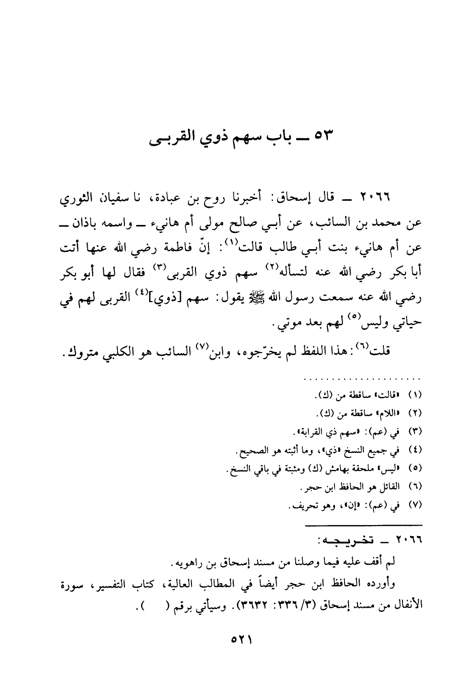 قَالَ إِسْحَاقُ أَخْبَرَنَا رَوْحُ بن عباده ثنا سُفْيَانُ الثَّوْرِيُّ عَنْ مُحَمَّدِ بْنِ السَّائِبِ عَنْ أَبِي صَالِحٍ مولى ام هاني وَاسْمُهُ بَاذَانُ عن ام هاني بِنْتِ أَبِي طَالِبٍ قَالَتْ ان فاطمه رَضِيَ الله عَنْها أَتَتْ أَبَا بَكْرٍ رَضِيَ الله عَنْه لِتَسْأَلَهُ §سَهْمَ ذَوِي الْقُرْبَى فَقَالَ لَهَا أَبُو بَكْرٍ رَضِيَ الله عَنْه سَمِعْتُ رَسُولَ اللَّهِ صَلَّى اللَّهُ عَلَيْهِ وَسَلَّمَ يَقُولُ سَهْمُ ذَوِي الْقُرْبَى لَهُمْ فِي حَيَاتِي وَلَيْسَ لَهُمْ بَعْدَ مَوْتِي قُلْتُ هَذَا اللَّفْظُ لَمْ يُخْرِجُوهْ وَابْنُ السَّائِبِ هُوَ الْكَلْبِيُّ مَتْرُوكٌ