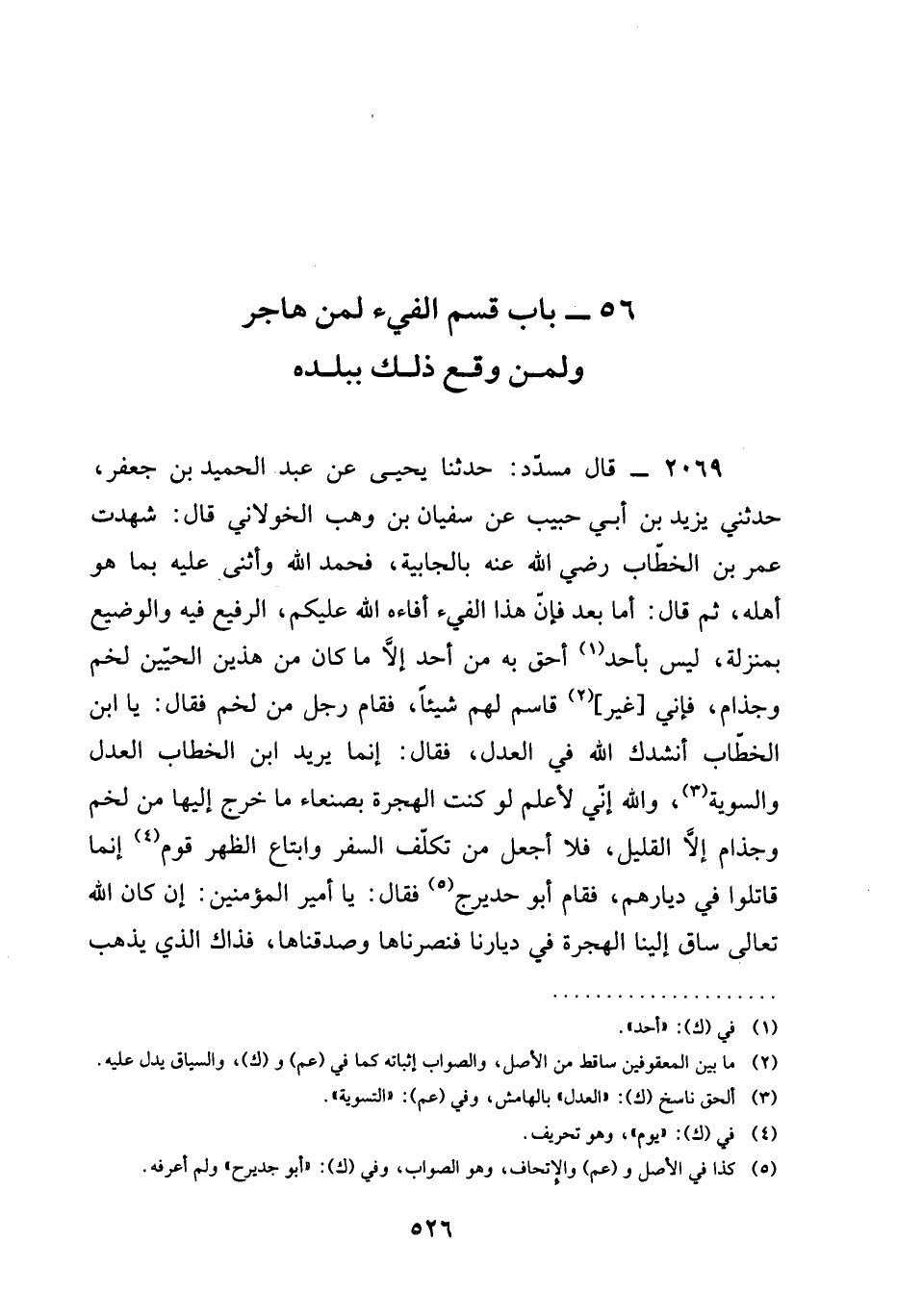 2069 - قَالَ مُسَدَّدٌ حَدَّثَنَا يَحْيَى عَنْ عَبْدِ الْحَمِيدِ بْنِ جَعْفَرٍ حَدَّثَنِي يَزِيدُ بْنُ أَبِي حَبِيبٍ عَنْ سُفْيَانَ بْنِ وهب الخولاني قا شَهِدْتُ عُمَرَ بْنِ الْخَطَّابِ رَضِيَ الله عَنْه بِالْجَابِيَةِ فَحَمِدَ اللَّهَ وَأَثْنَى عَلَيْهِ بِمَا هُوَ أَهْلُهُ ثُمَّ قَالَ أَمَّا بَعْدُ فَإِنَّ §هَذَا الْفَيْءَ أَفَاءَهُ اللَّهُ عَلَيْكُمْ الرَّفِيعُ فِيهِ وَالْوَضِيعُ بِمَنْزِلَةٍ لَيْسَ بِأَحَدٍ أَحَقَّ بِهِ مِنْ أَحَدٍ إِلَّا مَا كَانَ مِنْ هَذَيْنِ الْحَيَّيْنِ لَخْمٍ وَجِذَامٍ فَإِنِّي غَيْرُ قَاسِمٍ لَهُمْ شَيْئًا فَقَامَ رَجُلٌ مِنْ لَخْمٍ فَقَالَ يَا ابْنَ الْخَطَّابِ أَنْشُدُكَ اللَّهَ فِي الْعَدْلِ فَقَالَ إِنَّمَا يُرِيدُ ابْنُ الْخَطَّابِ الْعَدْلَ وَالسَّوِيَّةَ وَاللَّهِ إِنِّي لأعلم لو كنت الْهِجْرَةُ بِصَنْعَاءَ مَا خَرَجَ إِلَيْهَا مِنْ لَخْمِ وَجِذَامٍ إِلَّا الْقَلِيلُ فَلَا أَجْعَلُ مَنْ تَكَلَّفَ السَّفَرَ وَابْتَاعَ الظَّهْرَ قَوْمٍ إِنَّمَا قَاتَلُوا فِي دِيَارِهِمْ فَقَامَ أَبُو حُدَيْرِجٍ فَقَالَ يَا أَمِيرَ الْمُؤْمِنِينَ إِنْ كَانَ اللَّهُ تَعَالَى سَاقَ إِلَيْنَا الْهِجْرَةَ فِي دِيَارِنَا فَنَصَرْنَاهَا وَصَدَّقْنَاهَا فَذَاكَ الَّذِي يُذْهِبُ