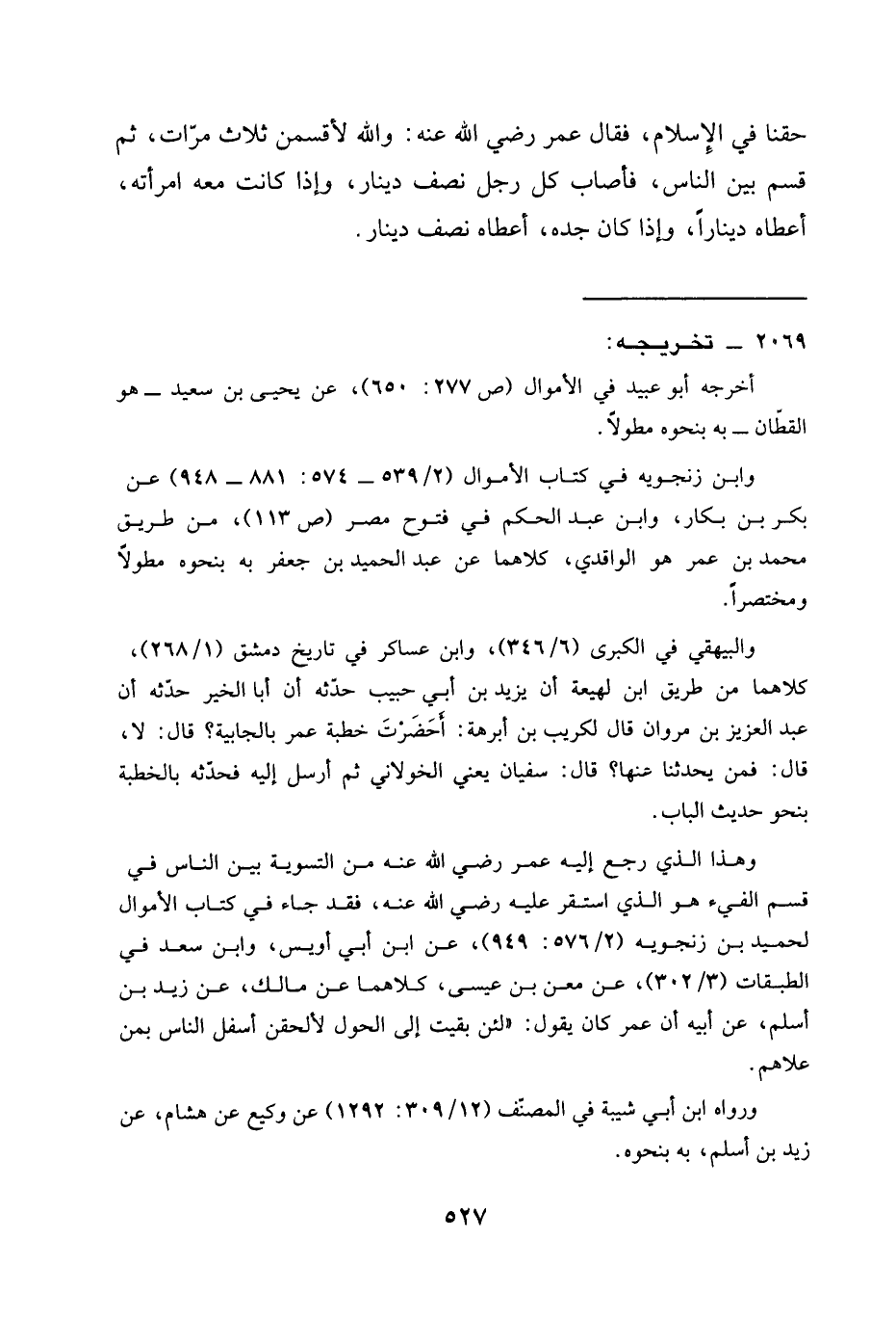 وهذا الذي رجع إليه عمر رضي الله عنه من التسوية بين الناس في قسم الفيء هو الذي استقر عليه رضي الله عنه، فقد جاء في كتاب الأموال لحميد بن زنجويه (2/ 576: 949)، عن ابن أبي أويس، وابن سعد في الطبقات (3/ 302)، عن معن بن عيسى، كلاهما عَنْ مَالِكِ، عَنْ زَيْدِ بْنِ أَسْلَمَ، عَنْ أبيه أن عمر كان يقول: "لئن بقيت إلى الحول لألحقن أسفل الناس بمن علاهم.