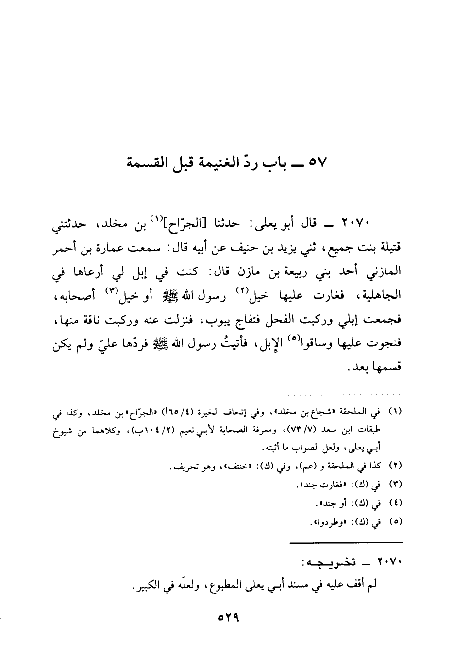 2070 - قَالَ أَبُو يَعْلَى حَدَّثَنَا الْجَرَّاحُ بْنُ مَخْلَدٍ حدثني قُتَيْلَةُ بِنْتُ جَمِيعٍ ثَنِي يَزِيدُ بْنُ حُنَيْفٍ عَنْ أَبِيهِ قَالَ سَمِعْتُ عُمَارَةَ بْنَ أَحْمَرَ الْمَازِنِيَّ أَحَدُ بَنِي رَبِيعَةَ بْنِ مَازِنٍ قَالَ كُنْتُ فِي إِبِلٍ لِي أَرْعَاهَا فِي الْجَاهِلِيَّةِ فَغَارَتْ عَلَيْهَا خَيْلُ رَسُولِ اللَّهِ صَلَّى اللَّهُ عَلَيْهِ وَسَلَّمَ أَوْ خَيْلُ أَصْحَابِهِ فَجَمَعْتُ إِبْلِي وَرَكِبْتُ الْفَحْلَ فَتَفَاجَّ يَبُوبُ فَنَزَلْتُ عَنْهُ وَرَكِبْتُ نَاقَةً مِنْهَا فَنَجَوْتُ عَلَيْهَا وَسَاقُوا الْإِبِلَ فَأَتَيْتُ رَسُولَ اللَّهِ صَلَّى اللَّهُ عَلَيْهِ وَسَلَّمَ §فَرَدَّهَا عَلَيَّ وَلَمْ يَكُنْ قَسَمَهَا بَعْدُ