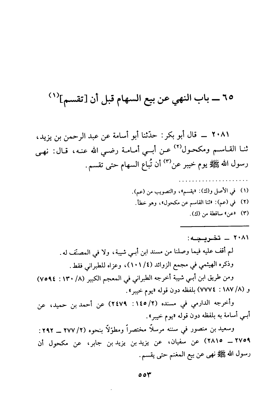 2081 - قَالَ أَبُو بَكْرٍ حَدَّثَنَا أَبُو أُسَامَةَ عَنْ عَبْدِ الرَّحْمَنِ بْنِ يَزِيدَ ثنا الْقَاسِمُ وَمَكْحُولٌ عَنْ أَبِي أُمَامَةَ رَضِيَ الله عَنه قَالَ §نَهَى رَسُولُ اللَّهِ صَلَّى اللَّهُ عَلَيْهِ وَسَلَّمَ يَوْمَ خبير عَنْ أَنْ تُبَاعَ السِّهَامُ حَتَّى تُقْسَمَ