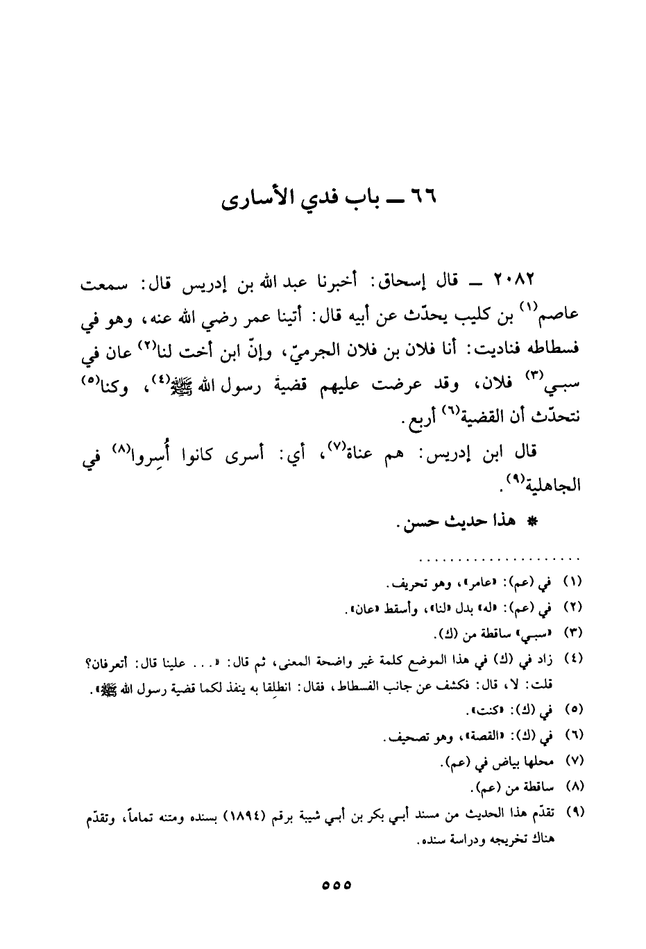 2082 - قَالَ إِسْحَاقُ أَخْبَرَنَا عَبْدُ اللَّهِ بْنُ إِدْرِيسَ قَالَ سَمِعْتُ عَاصِمِ بْنِ كُلَيْبٍ يُحَدِّثُ عَنْ أَبِيهِ قَالَ أَتَيْنَا عُمَرَ رَضِيَ الله عَنْه وَهُوَ فِي فُسْطَاطِهِ فَنَادَيْتُ أَنَا فُلَانُ بْنُ فُلَانٍ الْجَرْمِيُّ وَإِنَّ ابْنَ أُخْتٍ لَنَا عَانَ فِي سَبْي فُلَانٍ وَقَدْ §عُرِضَتْ عَلَيْهِمْ قَضِيَّةُ رَسُولِ اللَّهِ صَلَّى اللَّهُ عَلَيْهِ وَسَلَّمَ وَكُنَّا نَتَحَدَّثُ أَنَّ الْقَضِيَّةَ أَرْبَعٌ قَالَ ابْنُ إدريس هُمْ عُنَاةٌ أَيْ أُسَرَى كَانُوا أُسِرُوا فِي الْجَاهِلِيَّةِ