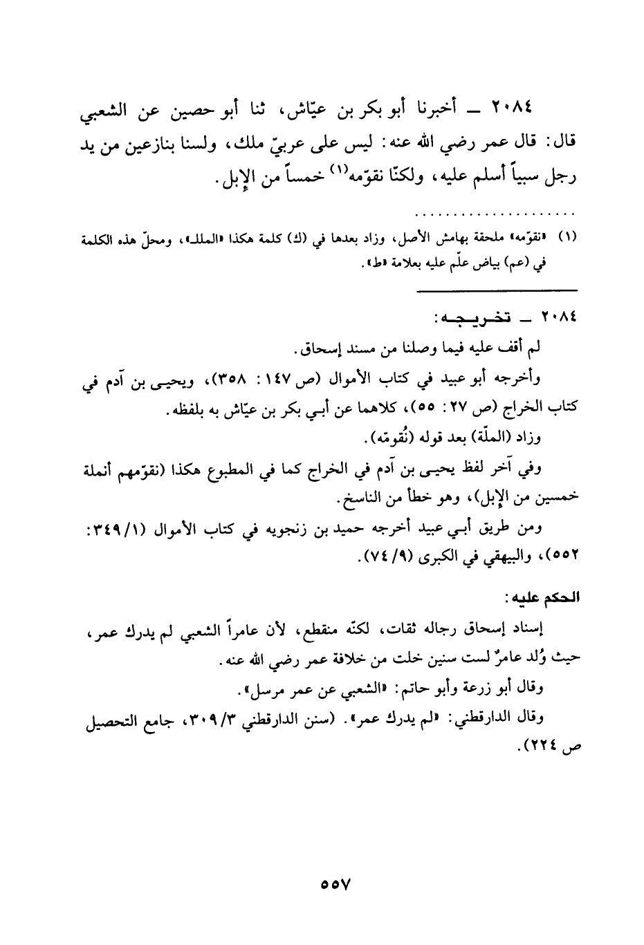 2084 - أَخْبَرَنَا أَبُو بَكْرِ بْنُ عَيَّاشٍ ثنا أَبُو حُصَيْنٍ عَنِ الشَّعْبِيِّ قَالَ قَالَ عُمَرُ رَضِيَ الله عَنْه لَيْسَ عَلَى عَرَبِيٍّ مِلْكٌ وَلَسْنَا بِنَازِعِينَ مِنْ يَدِ رَجُلٍ سَبْيًا أَسْلَمَ عَلَيْهِ §وَلَكِنَّا نُقَوِّمُهُ خَمْسًا مِنَ الْإِبِلِ