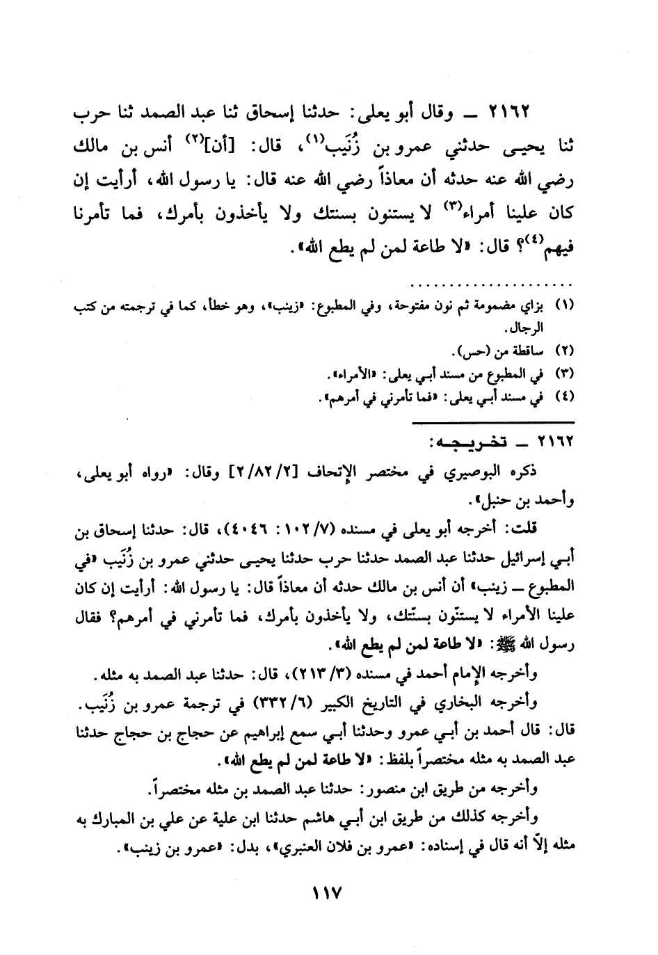 2162 - وَقَالَ أَبُو يَعْلَى حَدَّثَنَا إِسْحَاقُ ثنا عَبْدُ الصَّمَدِ ثنا حَرْبٌ ثنا يَحْيَى حَدَّثَنِي عَمْرُو بْنُ زَيْنَبَ قَالَ إِنَّ أَنَسَ بْنَ مَالِكٍ رَضِيَ الله عَنْهُ حَدَّثَهُ أَنَّ مُعَاذًا رَضِيَ الله عَنْهُ قَالَ يَا رَسُولَ اللَّهِ أَرَأَيْتَ إِنْ كَانَ عَلَيْنَا أُمَرَاءُ لَا يَسْتَنُّونَ بِسُنَّتِكَ وَلَا يَأْخُذُونَ بِأَمْرِكَ فَمَا تَأْمُرُنَا فِيهِمْ قَالَ §لَا طَاعَةَ لِمَنْ لَمْ يُطِعِ اللَّهَ