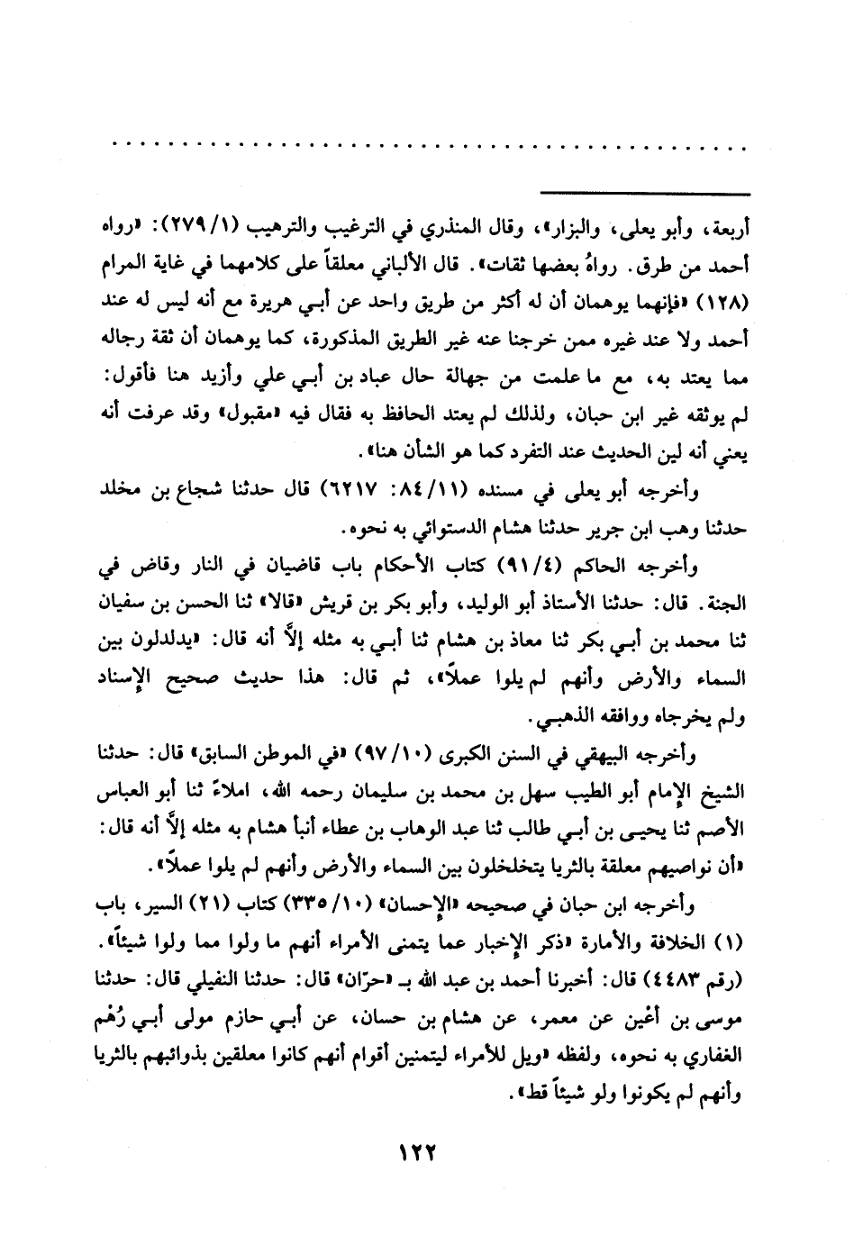 = أربعة، وأبو يعلى، والبزار"، وقال المنذري في الترغيب والترهيب (1/ 279): "رواه أحمد من طرق. رواهُ بعضها ثقات". قال الألباني معلقًا على كلامهما في غاية المرام (128) "فإنهما يوهمان أن له أكثر من طريق واحد عن أبي هريرة مع أنه ليس له عند أحمد ولا عند غيره ممن خرجنا عنه غير الطريق المذكورة، كما يوهمان أن ثقة رجاله مما يعتد به، مع ما علمت من جهالة حال عباد بن أبي علي وأزيد هنا فأقول: