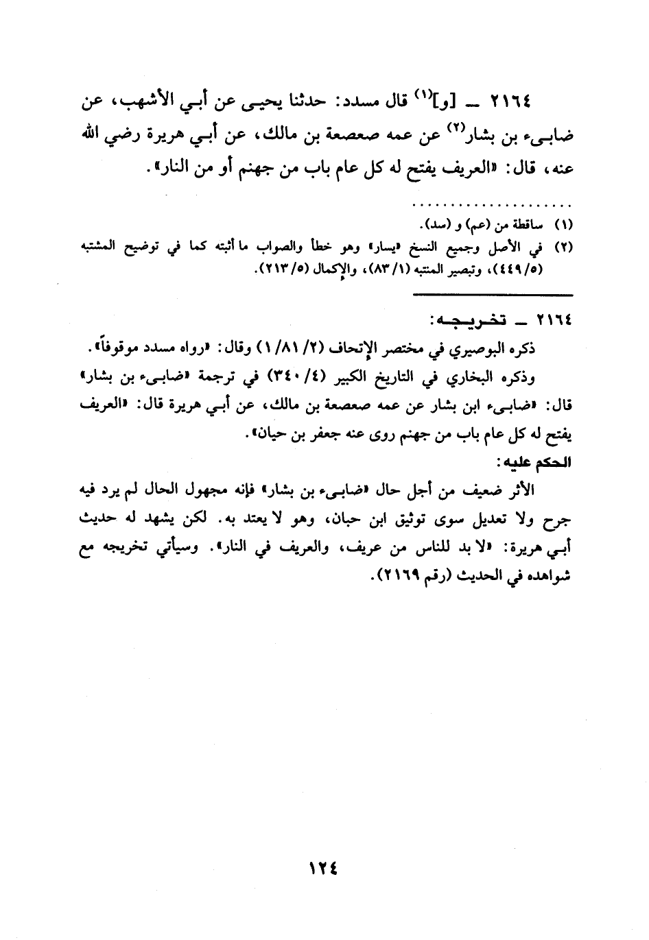 2164 - وَقَالَ مُسَدَّدٌ حدثنا يَحْيَى عَنْ أَبِي الأشهب عن ضابىء بن بشار عَنْ عَمِّهِ صعصة بْنِ مَالِكٍ عَنْ أَبِي هُرَيْرَةَ رَضِيَ الله عَنْه قَالَ §الْعَرِّيفُ يُفْتَحُ لَهُ كُلَّ عَامٍ بَابٌ مِنْ جَهَنَّمَ أَوْ مِنَ النَّارِ