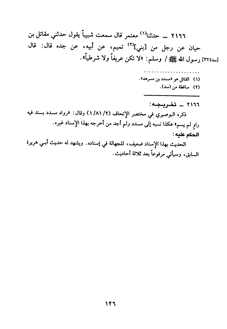 2166 - حَدَّثَنَا مَعتْمَرٌ قَالَ سَمِعْتُ شَبِيبًا يَقُولُ حَدَّثَنِي مُقَاتِلُ بْنُ حَيَّانَ عَنْ رَجُلٍ مِنْ بَنِي تَمِيمٍ عَنْ أَبِيهِ عَنْ جَدِّهِ قَالَ قَالَ رَسُولُ اللَّهِ صَلَّى اللَّهُ عَلَيْهِ وَسَلَّمَ §لَا تَكُنْ عَرِيفًا وَلَا شُرَطِيًّا