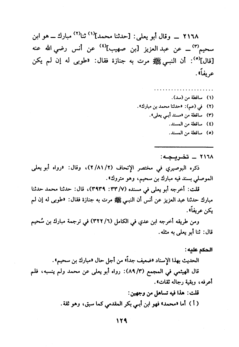 2168 - وَقَالَ أَبُو يَعْلَى حَدَّثَنَا مُحَمَّدٌ ثنا مُبَارَكٌ هُوَ ابْنُ سُحَيْمٍ عَنْ عَبْدِ الْعَزِيزِ بْنُ صُهَيْبٍ عَنْ أَنَسِ رَضِيَ الله عَنْهُ قَالَ إِنَّ النَّبِيَّ صَلَّى اللَّهُ عَلَيْهِ وَسَلَّمَ مَرَّتْ بِهِ جَنَازَةٌ فَقَالَ §طُوبَى لَهُ إِنْ لَمْ يَكُنْ عَرِيفًا