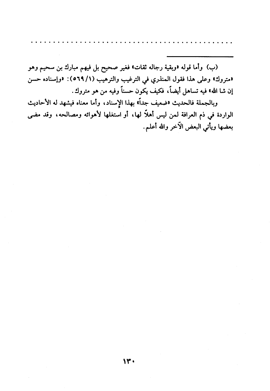 = (ب) وأما قوله "وبقية رجاله ثقات" فغير صحيح بل فيهم مبارك بن سحيم وهو "متروك" وعلى هذا فقول المنذري في الترغيب والترهيب (1/ 569): "وإسناده حسن إن شاء الله" فيه تساهل أيضًا، فكيف يكون حسنًا وفيه من هو متروك.