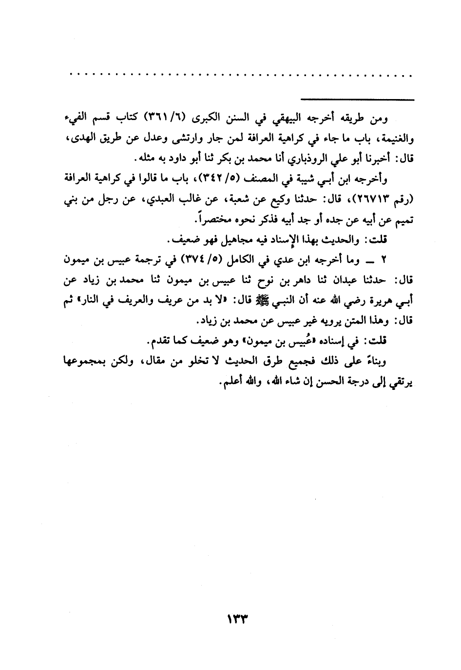 2 - وما أخرجه ابن عدي في الكامل (5/ 374) في ترجمة عبيس بن ميمون قال: حدّثنا عبدان ثنا داهر بن نوح ثنا عبيس بن ميمون ثنا محمد بْنِ زِيَادٍ عَنْ أَبِي هُرَيْرَةَ رَضِيَ اللَّهُ عَنْهُ أَنَّ النَّبِيَّ -صَلَّى اللَّهُ عَلَيْهِ وَسَلَّمَ- قال: "لا بد من عريف والعريف في النار" ثم قال: وهذا المتن يرويه غير عبيس عن محمَّد بن زياد.