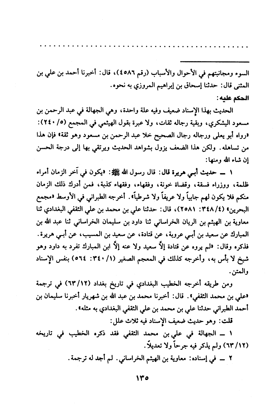 1 - حديث أَبِي هُرَيْرَةَ قَالَ: قَالَ رَسُولُ اللَّهِ -صَلَّى الله عليه وسلم-: "يكون في آخر الزمان أمراء ظلمة، ووزراء فسقة، وقضاة خونة، وفقهاء، وفقهاء كذبة، فمن أدرك ذلك الزمان منكم فلا يكون لهم جابيًا ولا عريفًا ولا شرطيًا". أخرجه الطبراني في الأوسط "مجمع البحرين" (4/ 348: 2581)، قال: حدّثنا علي بن محمَّد بن علي الثقفي البغدادي ثنا معاوية بن الهيثم بن الريان الخراساني ثنا داود بن سليمان الخراساني ثنا عبد الله بن المبارك عَنْ سَعِيدِ بْنِ أَبِي عَرُوبَةَ، عَنْ قَتَادَةَ، عَنْ سَعِيدِ بْنِ الْمُسَيِّبِ، عَنْ أَبِي هُرَيْرَةَ.