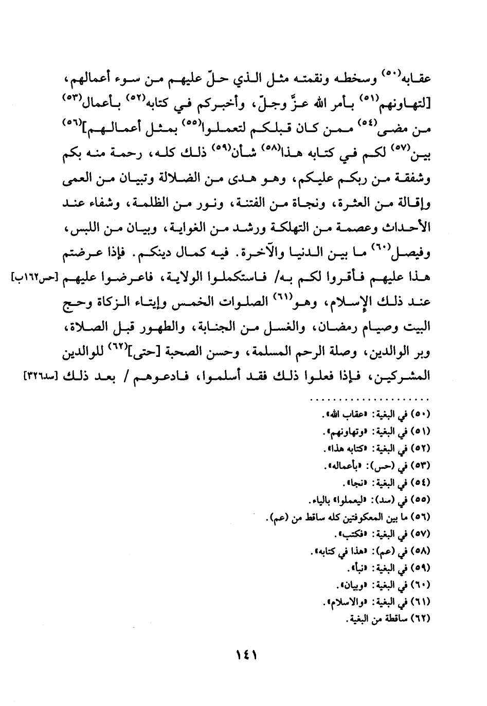 عِقَابِهِ (¬50) وَسَخَطِهِ وَنِقْمَتِهِ مِثْلُ الَّذِي حَلَّ عَلَيْهِمْ من سوء أعمالهم، [لتهاونهم (¬51) بأمر الله عزَّ وجلّ، وأخبركم في كتابه (¬52) بأعمال (¬53) من مضى (¬54) ممن كان قبلكم لتعملوا (¬55) بمثل أَعْمَالِهِمْ] (¬56) بَيَّنَ (¬57) لَكُمْ فِي كِتَابِهِ هَذَا (¬58) شَأْنَ (¬59) ذلك كله، رحمة منه بكم وشفقة مِنْ رَبِّكُمْ عَلَيْكُمْ، وَهُوَ هُدًى مِنَ الضَّلَالَةِ وتبيان من العمى وإقالة من العثرة، ونجاة من الفتنة، ونور من الظلمة، وشفاء عند الأحداث وعصمة من التهلكة ورشد من الغواية، وبيان من اللبس، وفيصل (¬60) مَا بَيْنَ الدُّنْيَا وَالْآخِرَةِ. فِيهِ كَمَالُ دِينِكُمْ. فَإِذَا عَرَضْتُمْ هَذَا عَلَيْهِمْ فَأَقَرُّوا لَكُمْ بِهِ فَاسْتَكْمِلُوا الْوَلَايَةَ، فَاعْرِضُوا عَلَيْهِمْ عِنْدَ ذَلِكَ الإِسلام، وَهُوَ (¬61) الصَّلَوَاتُ الْخَمْسُ وَإِيتَاءُ الزَّكَاةِ وَحَجُّ الْبَيْتِ وَصِيَامُ رَمَضَانَ، وَالْغُسْلُ مِنَ الْجَنَابَةِ، وَالطُّهُورُ قَبْلَ الصلاة، وبر الوالدين، وصلة الرحم المسلمة، وحسن الصحبة [حتى] (¬62) للوالدين الْمُشْرِكَيْنِ، فَإِذَا فَعَلُوا ذَلِكَ فَقَدْ أَسْلَمُوا، فَادْعُوهُمْ بعد ذلك