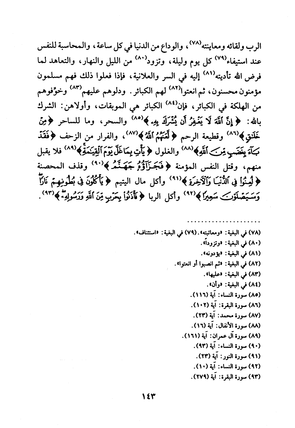 الرب ولقائه ومعاينته (¬78)، وَالْوَدَاعِ مِنَ الدُّنْيَا فِي كُلِّ سَاعَةٍ، وَالْمُحَاسَبَةِ لِلنَّفْسِ عِنْدَ اسْتِيفَاءِ (¬79) كُلِّ يَوْمٍ وَلَيْلَةٍ، وَتَزَوُّدٍ (¬80) مِنَ اللَّيْلِ وَالنَّهَارِ، وَالتَّعَاهُدِ لِمَا فَرَضَ اللَّهُ تَأْدِيَتَهُ (¬81) إِلَيْهِ فِي السِّرِّ وَالْعَلَانِيَةِ، فَإِذَا فَعَلُوا ذلك فهم مسلمون مؤمنون محسنون، ثم انعتوا (¬82) لهم الكبائر. ودلوهم عليهم (¬83) وخوِّفوهم من الهلكة في الكبائر، فإن (¬84) الكبائر هي الموبقات، وأولاهن: الشِّرْكُ بِاللَّهِ: {إِنَّ اللَّهَ لَا يَغْفِرُ أَنْ يُشْرَكَ بِهِ} (¬85) وَالسِّحْرُ، وَمَا لِلسَّاحِرِ {مِنْ خَلَاقٍ} (¬86) وَقَطِيعَةُ الرَّحِمِ (لَعَنهَمُ الله) (¬87)، والفرار في الزحف {فَقَدْ بَاءَ بِغَضَبٍ مِنَ اللَّهِ} (¬88) والغلول {يَأْتِ بِمَا غَلَّ يَوْمَ الْقِيَامَةِ} (¬89) فَلَا يُقْبَلُ مِنْهُمْ، وَقَتْلُ النَّفْسِ المؤمنة {فَجَزَاؤُهُ جَهَنَّمُ} (¬90) وَقَذْفُ الْمُحْصَنَةِ {لُعِنُوا فِي الدُّنْيَا وَالْآخِرَةِ} (¬91) وَأَكْلُ مَالِ الْيَتِيمِ {يَأْكُلُونَ فِي بُطُونِهِمْ نَارًا وَسَيَصْلَوْنَ سَعِيرًا} (¬92) وكل الربا {فَأْذَنُوا بِحَرْبٍ مِنَ اللَّهِ وَرَسُولِهِ} (¬93).