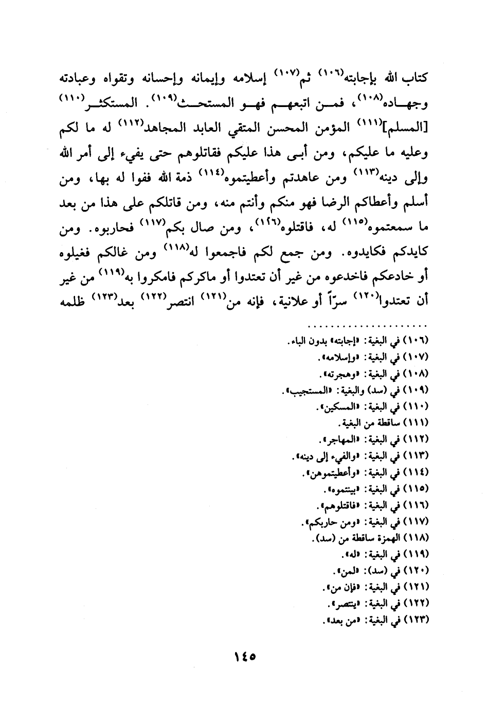 كتاب الله بإجابته (¬106) ثم (¬107) إسلامه وإيمانه وإحسانه وتقواه وعبادته وجهاده (¬108)، فمن اتبعهم فهو المستحث (¬109). المستكثر (¬110) [المسلم] (¬111) المؤمن المحسن المتقي الْعَابِدُ الْمُجَاهِدُ (¬112) لَهُ مَا لَكُمْ وَعَلَيْهِ مَا عَلَيْكُمْ، وَمَنْ أَبَى هَذَا عَلَيْكُمْ فَقَاتِلُوهُمْ حَتَّى يفيء إلى أمر الله وإلى دينه (¬113) ومن عاهدتم وأعطيتموه (¬114) ذمة الله ففوا لَهُ بِهَا، وَمَنْ أَسْلَمَ وَأَعْطَاكُمُ الرِّضَا فَهُوَ مِنْكُمْ وَأَنْتُمْ مِنْهُ، وَمَنْ قَاتَلَكُمْ عَلَى هَذَا من بعد ما سمعتموه (¬115) له، فاقتلوه (¬116)، ومن صال بكم (¬117) فَحَارِبُوهُ. وَمَنْ كَايَدَكُمْ فَكَايِدُوهُ. وَمَنْ جَمَعَ لَكُمْ فاجمعوا له (¬118) ومن غَالَكُمْ فَغِيلُوهُ أَوْ خَادَعَكُمْ فَاخْدَعُوهُ مِنْ غَيْرِ أن تعتدوا أو ماكركم فَامْكُرُوا بِهِ (¬119) مِنْ غَيْرِ أَنْ تَعْتَدُوا (¬120) سِرًّا أو علانية، فإنه من (¬121) انتصر (¬122) بعد (¬123) ظلمه