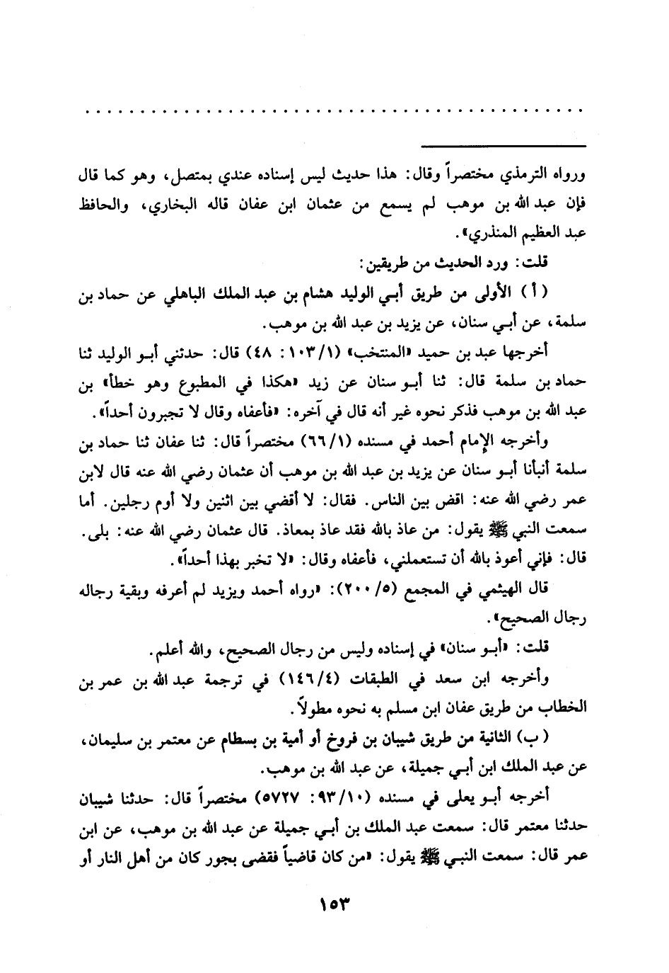 وأخرجه الإمام أحمد في مسنده (1/ 66) مختصرًا قال: ثنا عفان ثنا حماد بن سلمة أنبأنا أَبُو سِنَانَ عَنْ يَزِيدَ بْنِ عَبْدِ اللَّهِ بن موهب إِن عُثْمَانَ رَضِيَ اللَّهُ عَنْهُ قَالَ لِابْنِ عمر رضي الله عنه: اقْضِ بَيْنَ النَّاسِ. فَقَالَ: لَا أَقْضِي بَيْنَ اثنين ولا أوم رجلين. أما سَمِعْتُ النَّبِيَّ -صَلَّى اللَّهُ عَلَيْهِ وَسَلَّمَ- يَقُولُ: مَنْ عَاذَ بِاللَّهِ فَقَدْ عَاذَ بِمَعَاذٍ. قَالَ عثمان رضي الله عنه: بلى. قال: فإني أعوذ بالله أن تستعملني، فأعفاه وقال: "لا تخبر بهذا أحدًا".